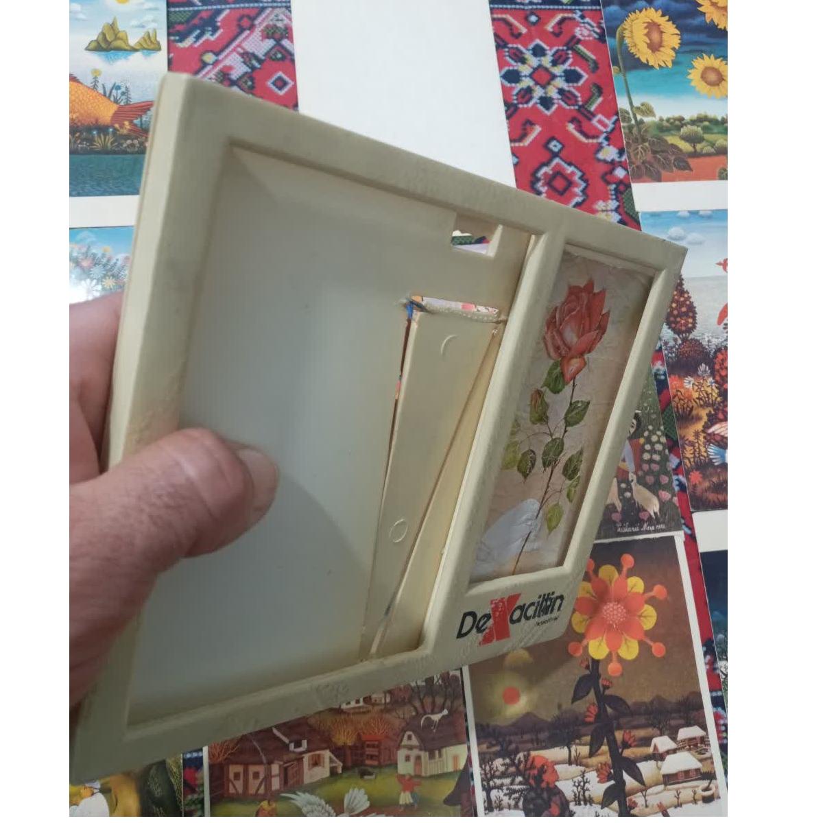 1 عدد قاب عکس قدیمی به همراه 11 عدد کارت پستال قدیمی.بسیار زیبا و خاطره انگیز...لازم به ذکر است که پایه قاب عکس از یک قسمت جدا شده ولی قابل استفاده هست...