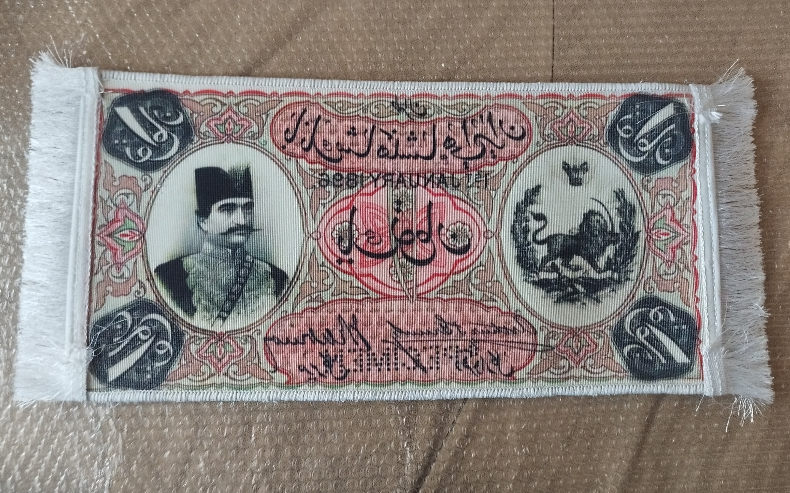 طرح نقش اسکناس یک تومان ناصرالدین شاه قاجار به شکل تابلو فرش