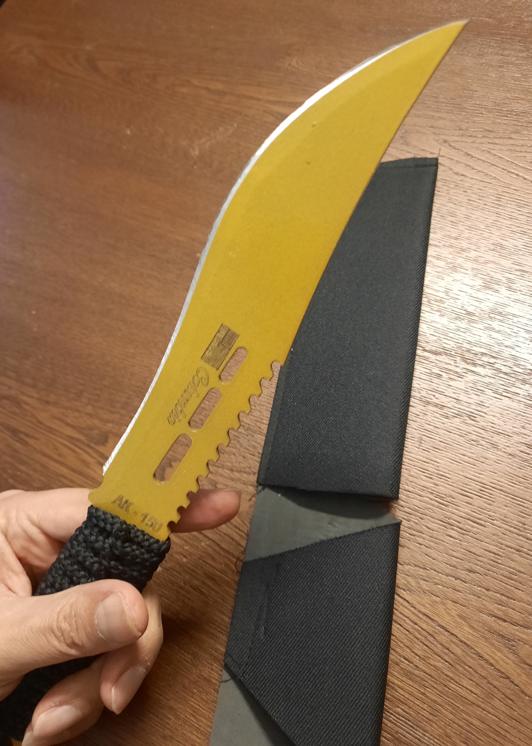 چاقو بوشکرافت فولادی تیغه ضدزنگ 32 سانتی با غلاف برزنتی و دسته طناب پیچ رنگ طلائی