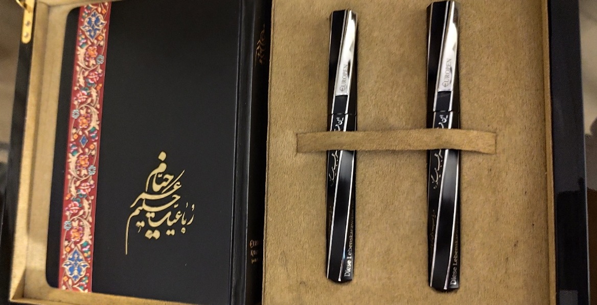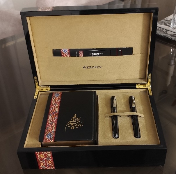 قلمها و کتاب در یک جعبه چوبی لاکالکل با طراحی پیانو پولیش و پوشش مخمل قرار گرفتهاند که ظاهری بسیار شیک و لوکس دارد.