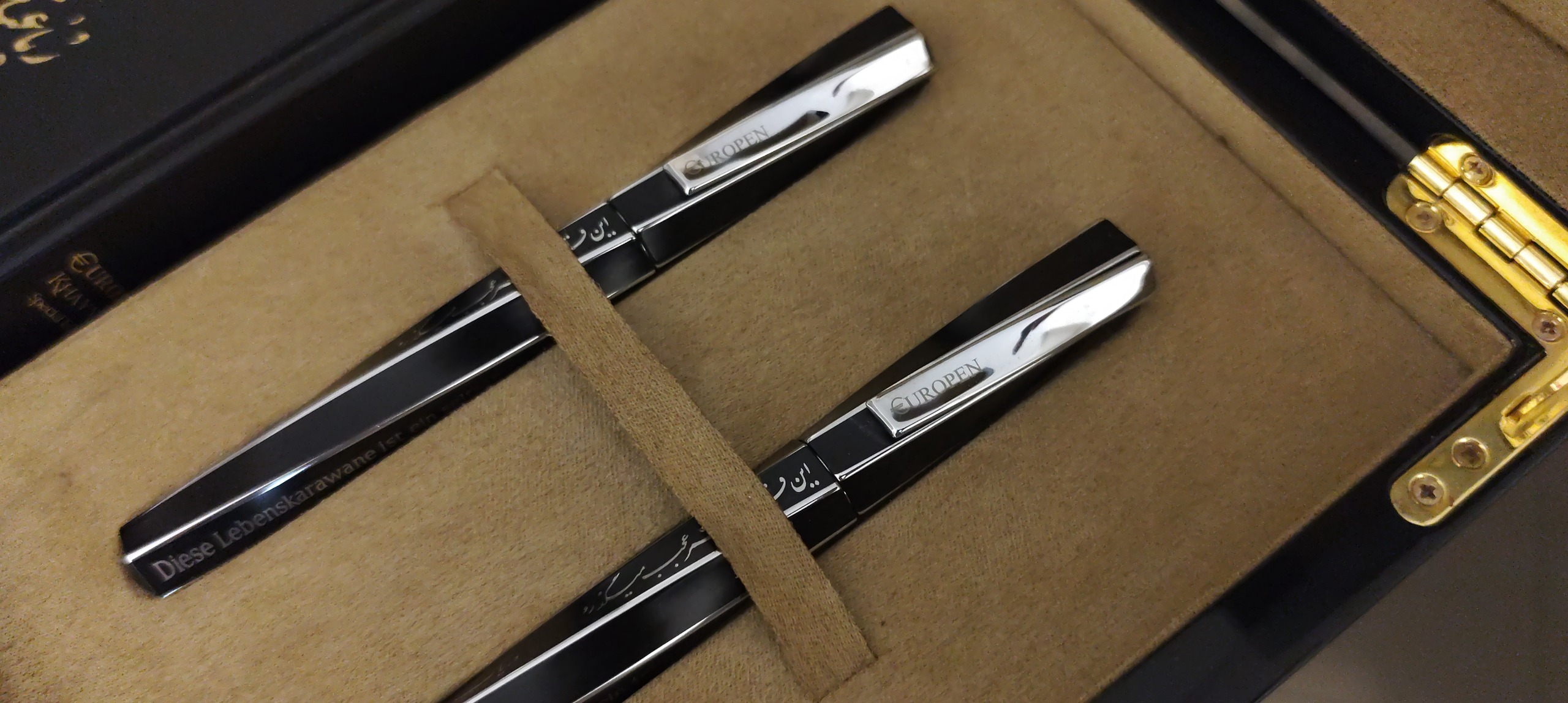هر دو قلم دارای بدنهای فلزی با طراحی مارپیچ هستند که با طلای خالص 1 میکرون آبکاری شدهاند. نوک خودنویس از طلای 24 عیار ساخته شده است.