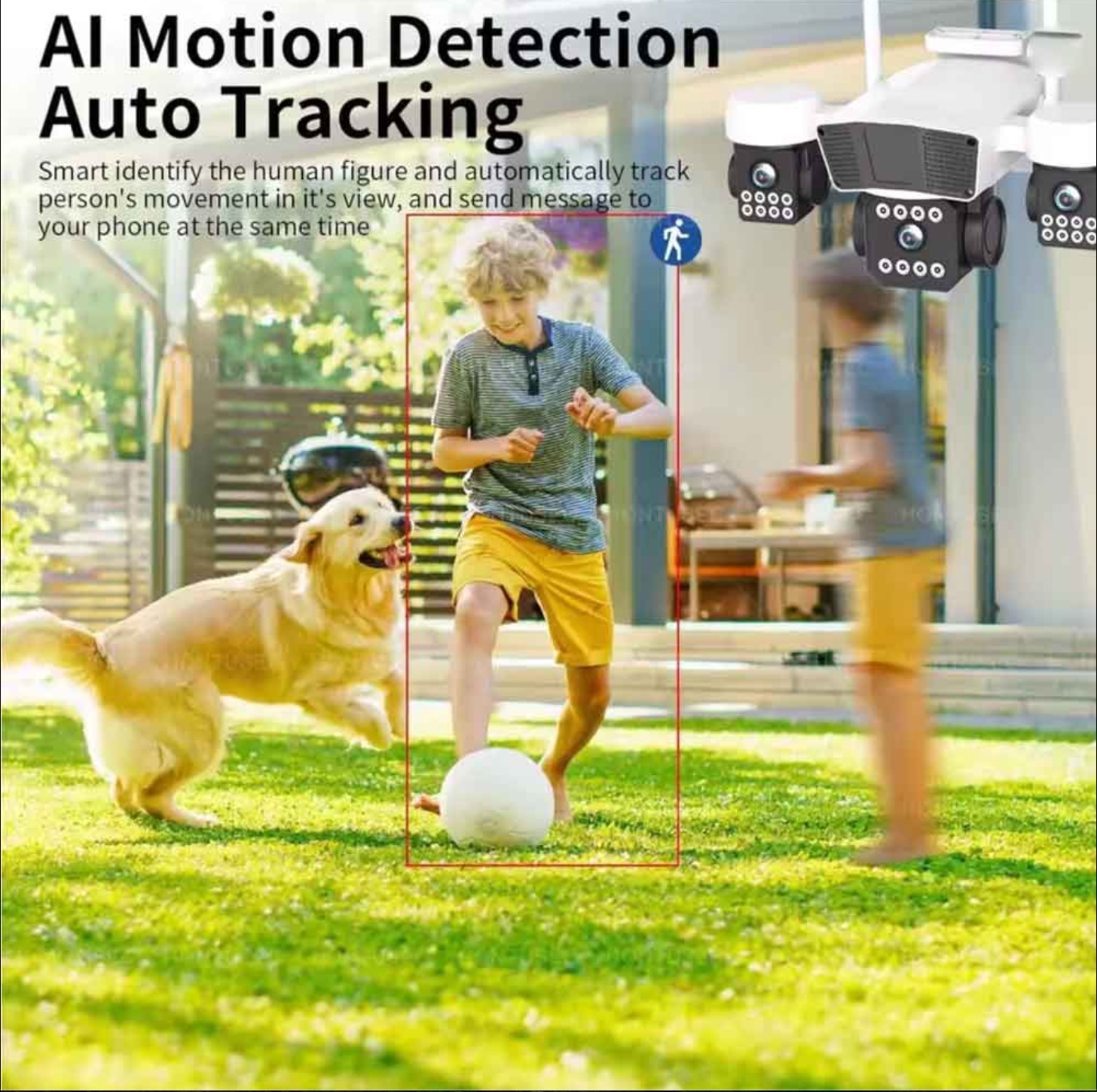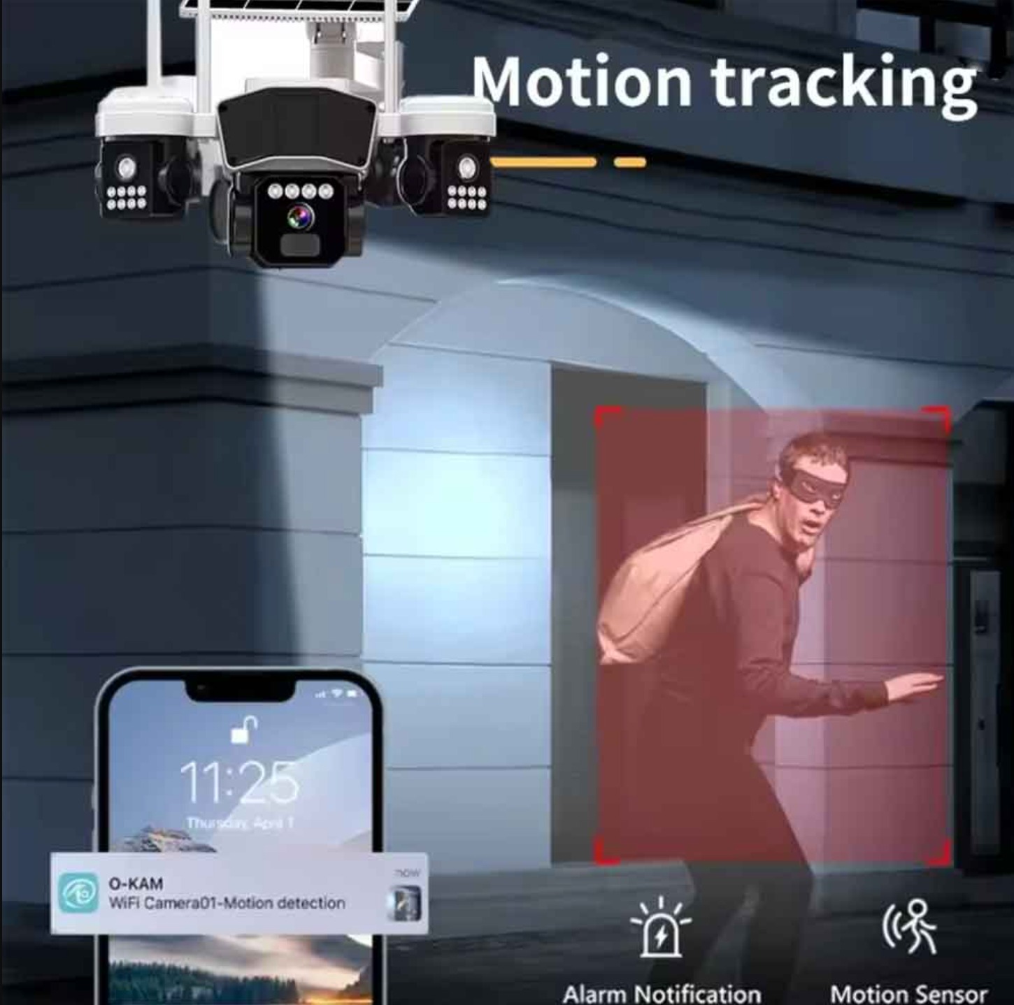 برای هر دوربین( لنز وسط موتوردار ) با استفاده از گوشی همراه و یا به صورت مجزا برای ترکری شی در حال حرکت رو ترکری میکند دارای سنسور سخت افزاری Pir جهت بهینه سازی مصرف انرژی در دوربین به کار رفته دارای باتری داخلی 19000 هزار میلی آمپر ولتاژ ورودی این دوربین