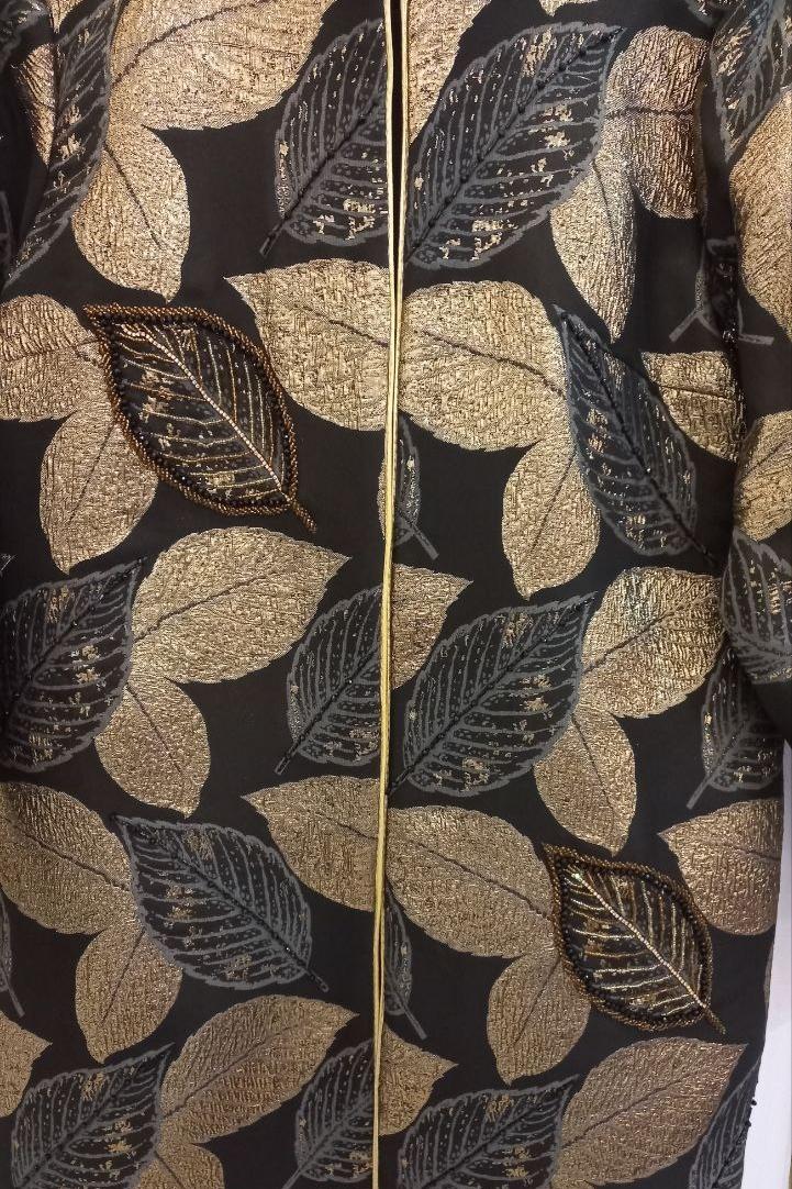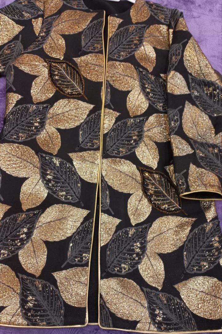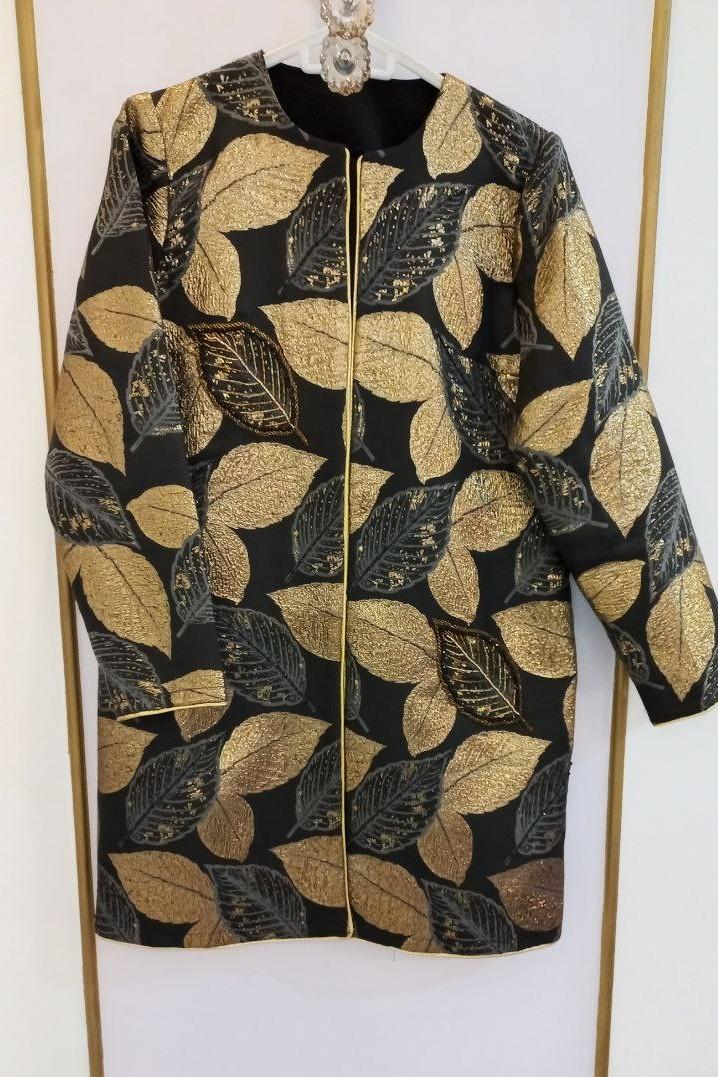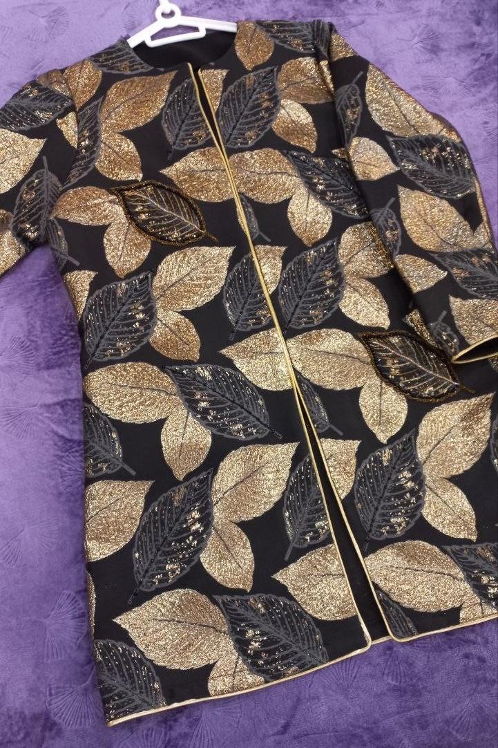 این کار فقط دو بار به مدت چند ساعت پوشیده شده. کار رو مزون دوخته پارچه ژاکارد اصل هست و روی کت تماما کار دست و منجوق دوزی هست. دور مانتو و سر آستین مغزی دوزی شده است.