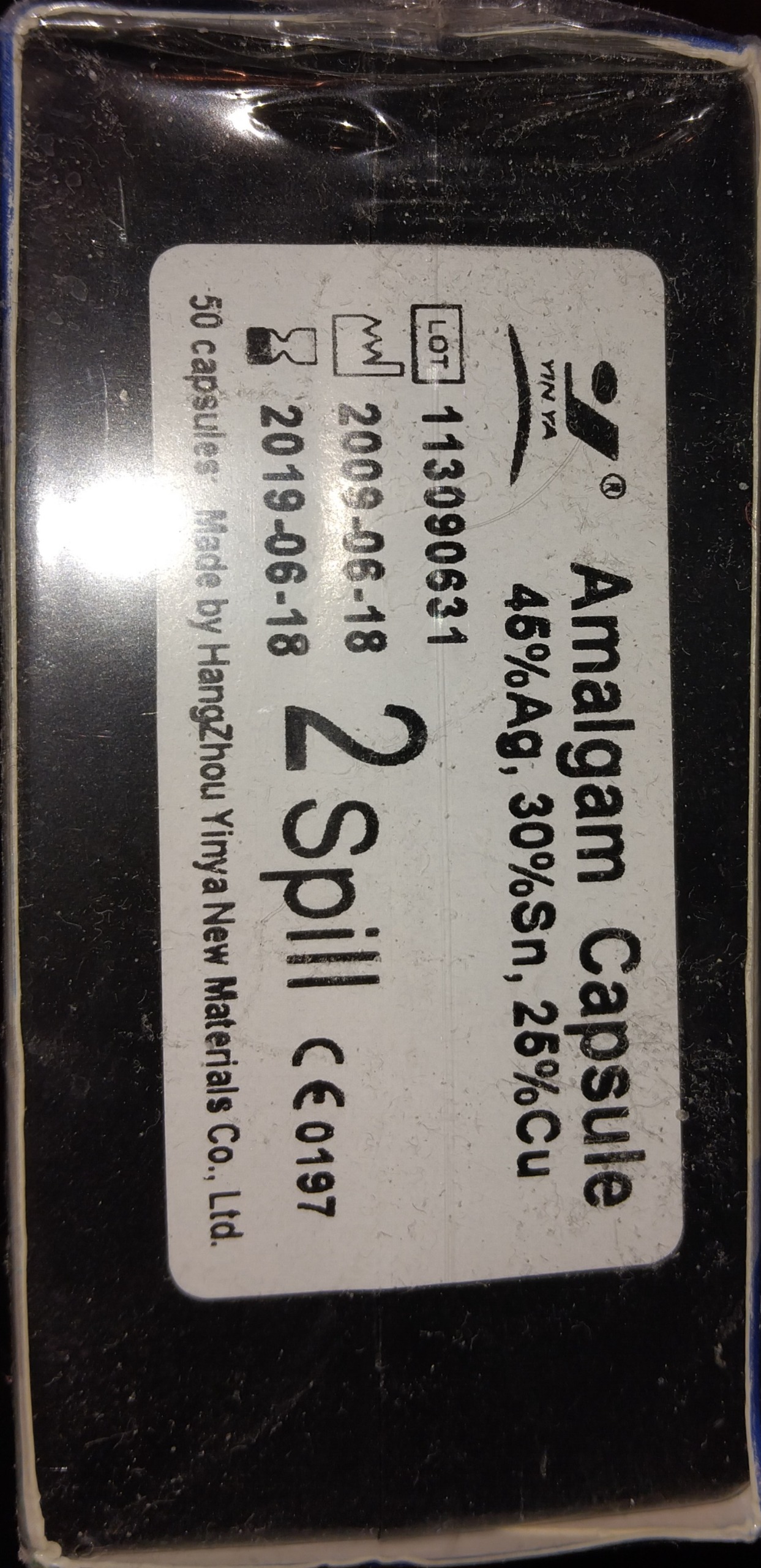 امالکپ دندانپزشکی .با تاریخ انقضا سال 2019.هر کپسول شامل مایع جیوه و پودر الیاژ نقره 45 درصد و قلع 35 درصد و مس 25 درصد است.جزییات روی بسته بندی بدقت نوشته شده. با توجه به تاریخ انقضا کالا این فروش صرفا برای بازیافت فلزات است و نه برای مصرف اصلی آن. این مزایده برای یک بسته امالکپ است.درون هر بسته 50 کپسول کوچک دو واحدی شامل پودر الیاژ امالگام و به مقدار تقریبا مساوی جیوه هست.اگر با این کالا آشنایی ندارید لطفا حتما قبل از شرکت در مزایده در اینترنت بررسی کنید یا سوال کنید ،چون بازیافت این فلزات یک کار کاملا تخصصی است و نیاز به تبحر و تجربه در زمینه بازیافت فلزات دارد .قیمت پایین کالا بدلیل منقضی بودن تاریخ مصرف کالا است.