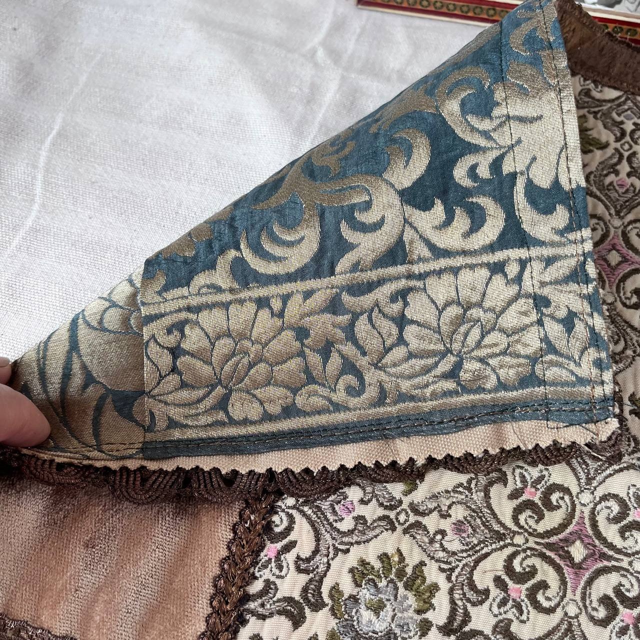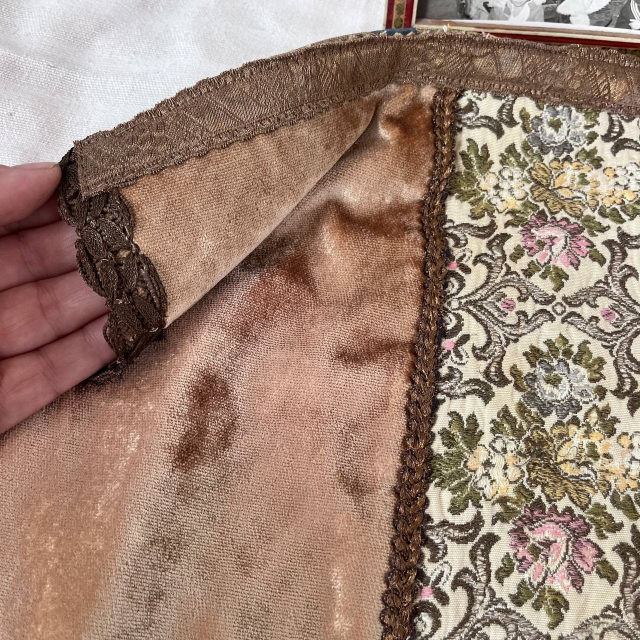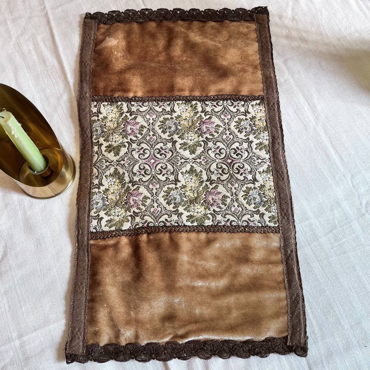 رومیزی قدیمی خارجی ترکیب مخمل رنگ بژ یا طلایی تیره پارچه شنل و یراقهای زیبای سیمی قدیمی
