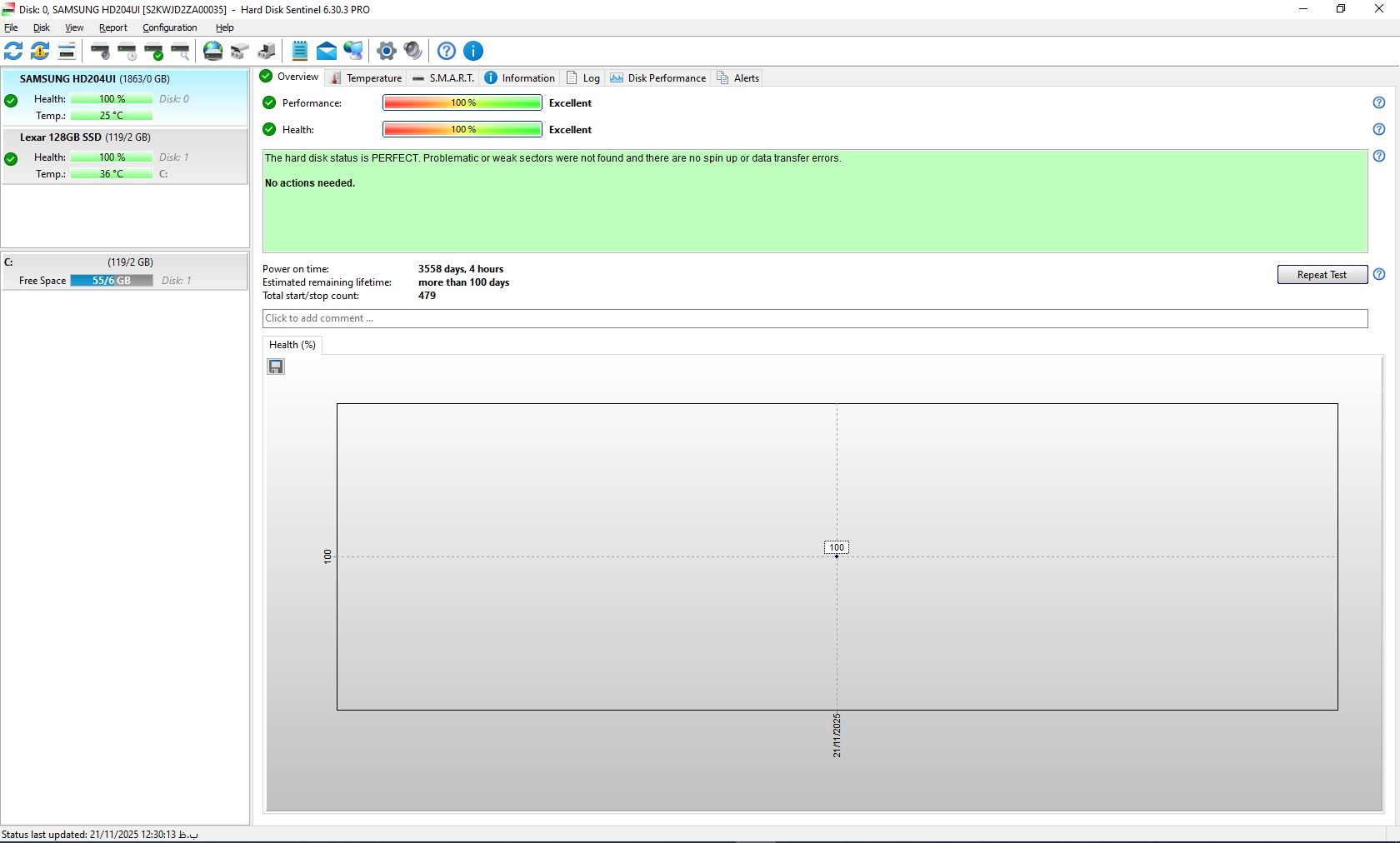 کارکرد طبق نرم افزار 3558 روز هستش . اگر دقت کنید متوجه می شید این هارد بصورت 24*7 بوده ( سروری یا دوربین ) . اگر عدد Total start/stop count 479را ببینید متوجه می شید که موتور و هد روی هارد خیلی کم کار بودن و استهلاک چندانی تا الان نداشتن و بر خلاف معمول از روز کارکرد هارد خیلی خیلی کمتره و می تونید با خیال راحت استفاده کنید . فروش بصورت مزایده ، از علاقه مندان و خریداران محترم دعوت می شود در مزایده شرکت کنند . سوال داشتید در خدمتم