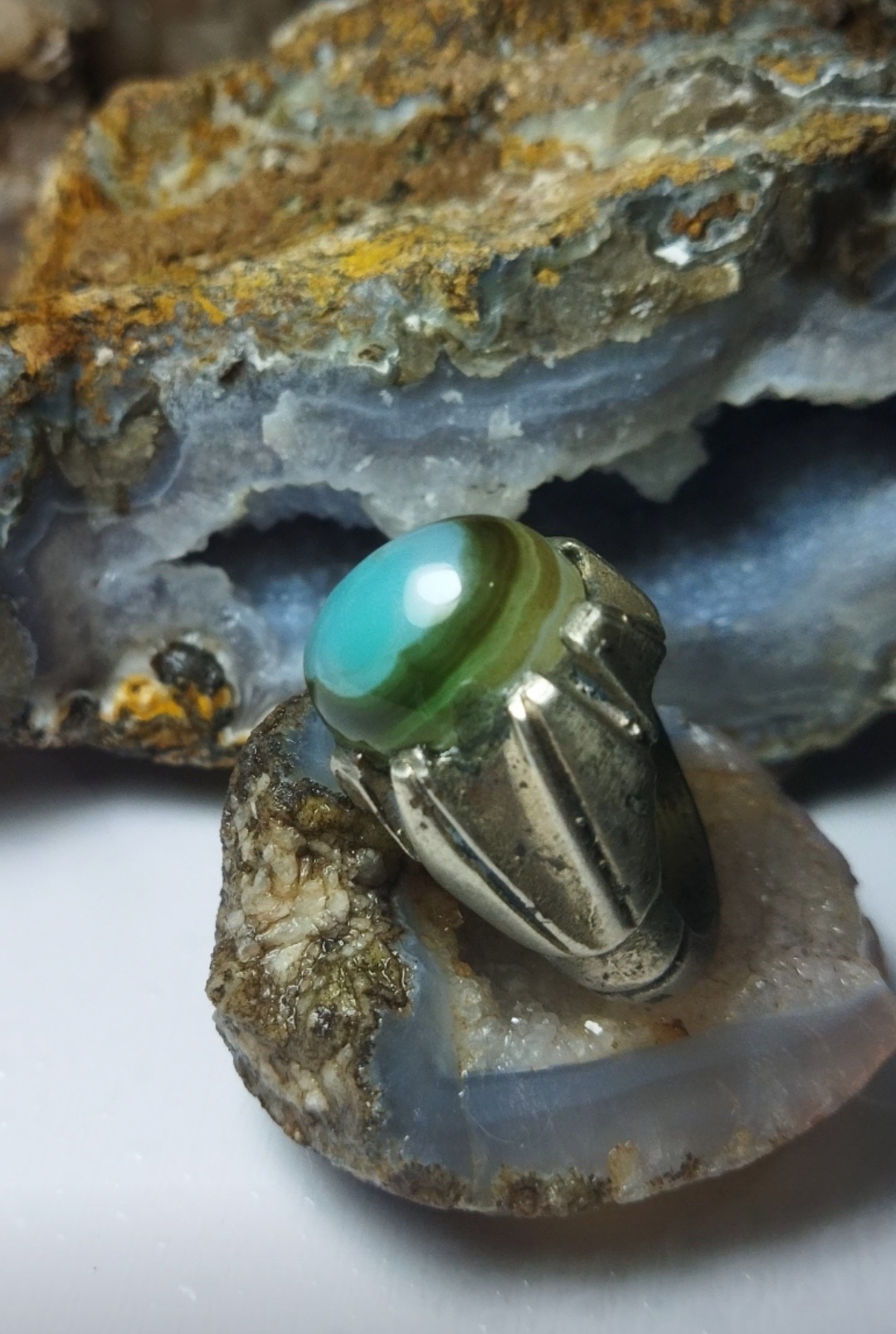 انگشتر با نگین کم نظیر معدنی و اصلی سلطامی با رگه های واضح زمینه رنگ ابی اسمانی و رگه های زیبا