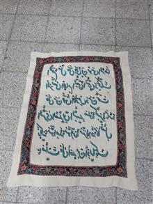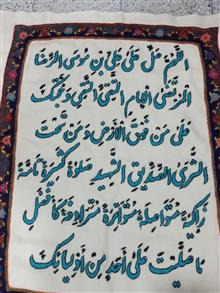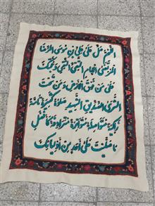 پته کرمان  تابلویی مزین به صلوات خاصه امام رضا.تماما دستباف و گلدوزیها و نوشته ها همه دست دوز .کاری خاص و انتیک .سایز 85 در 67 سانت