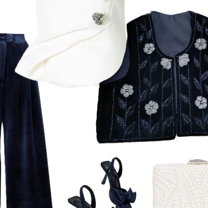 جلیقه مشکی شکوفههای گیلاس به همراه شلوار سرمهای مخمل و تاپ سفید دکلته استایلی لوکس و چشمنوازی خلق میکند