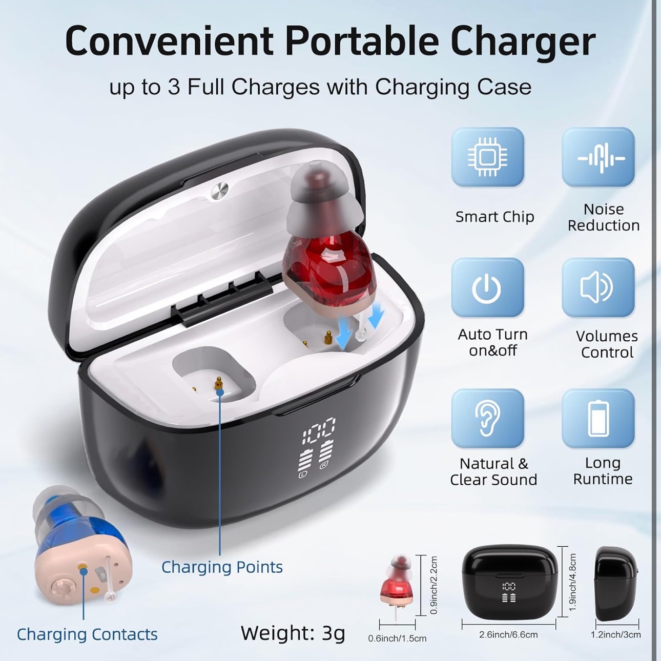 دستگاه سمعکصدا قابل شارژ با قاب شارژ - روشن/خاموش شدن خودکار و قابلیت حذف نویز، صدای واضح و حجم صدای قابل تنظیم