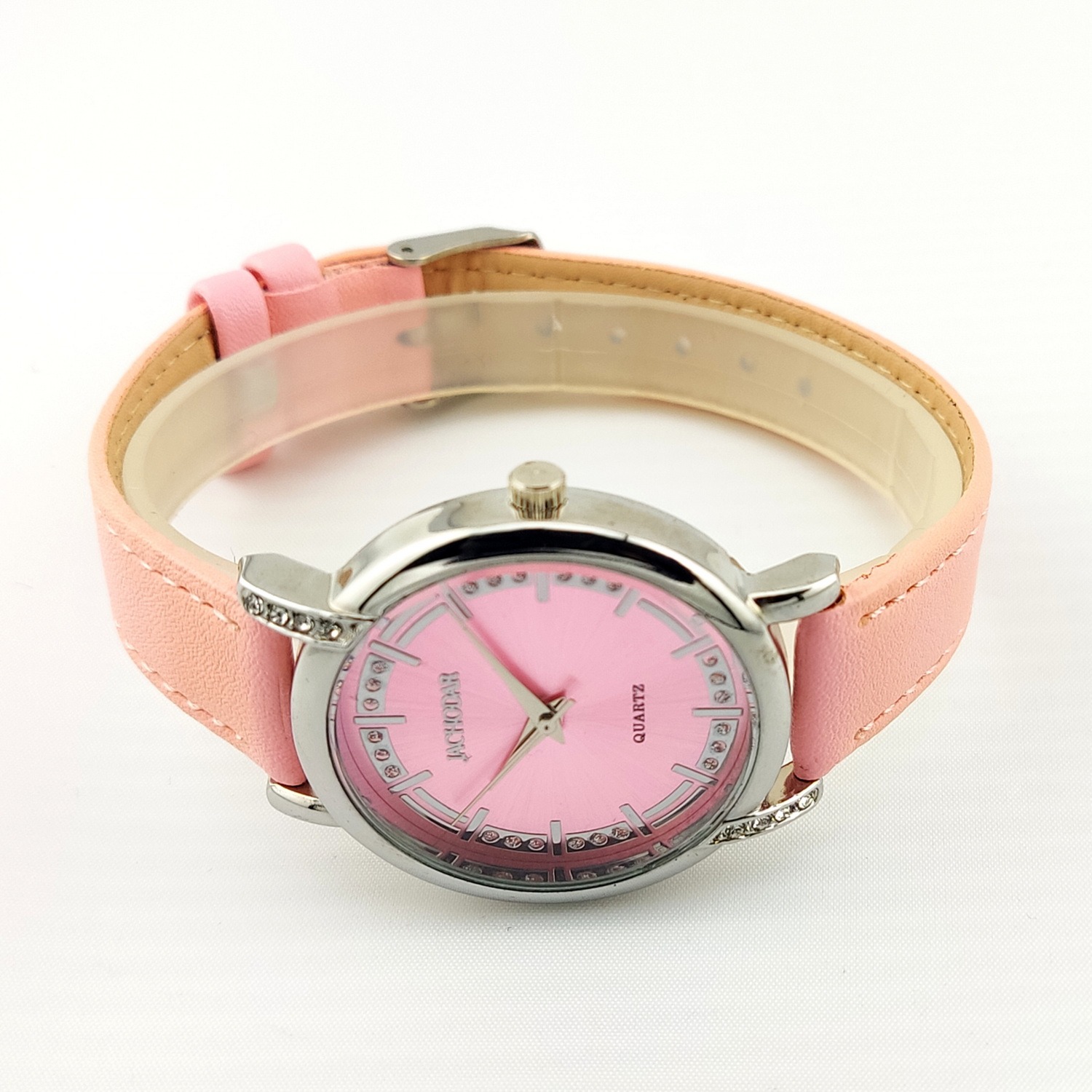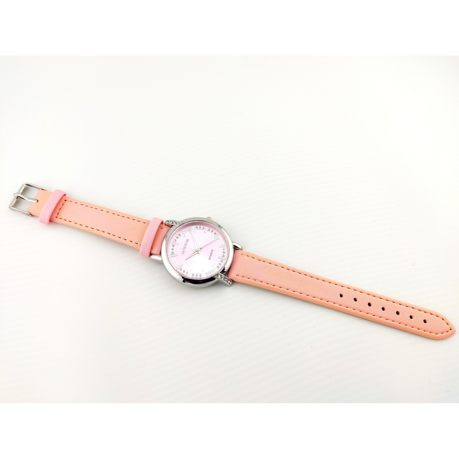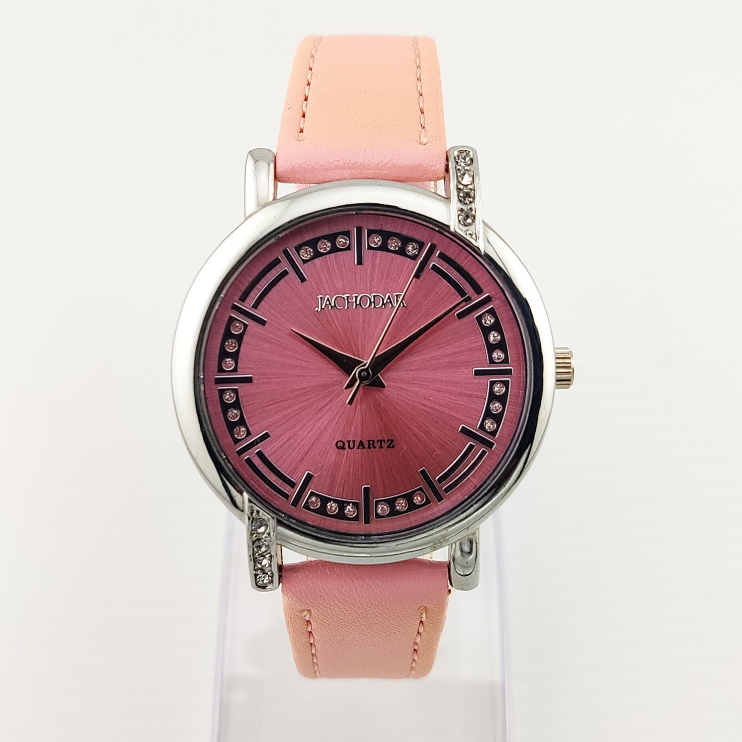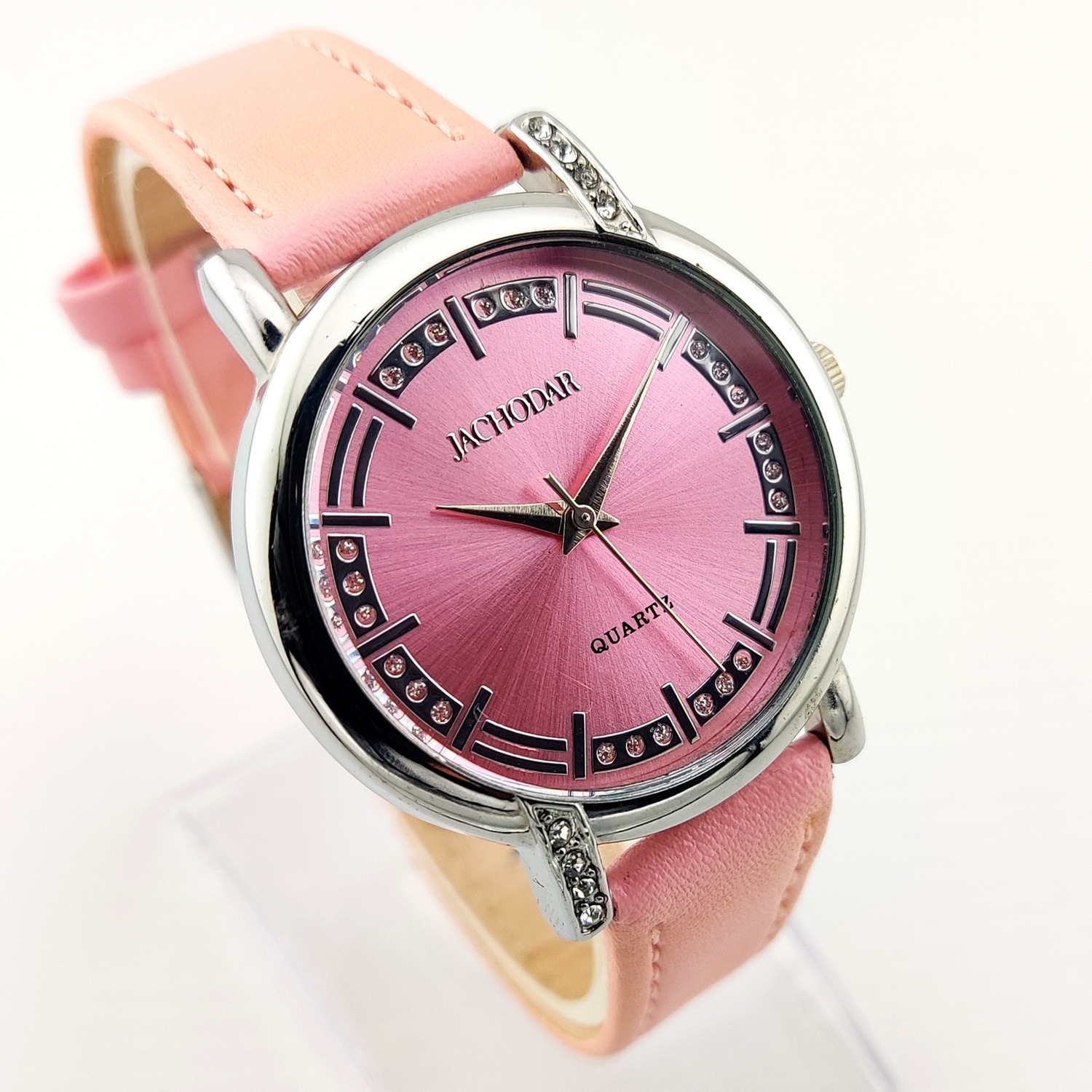 ساعت عقربه ای زنانه نگیندار بند چرم صورتی ضدآب