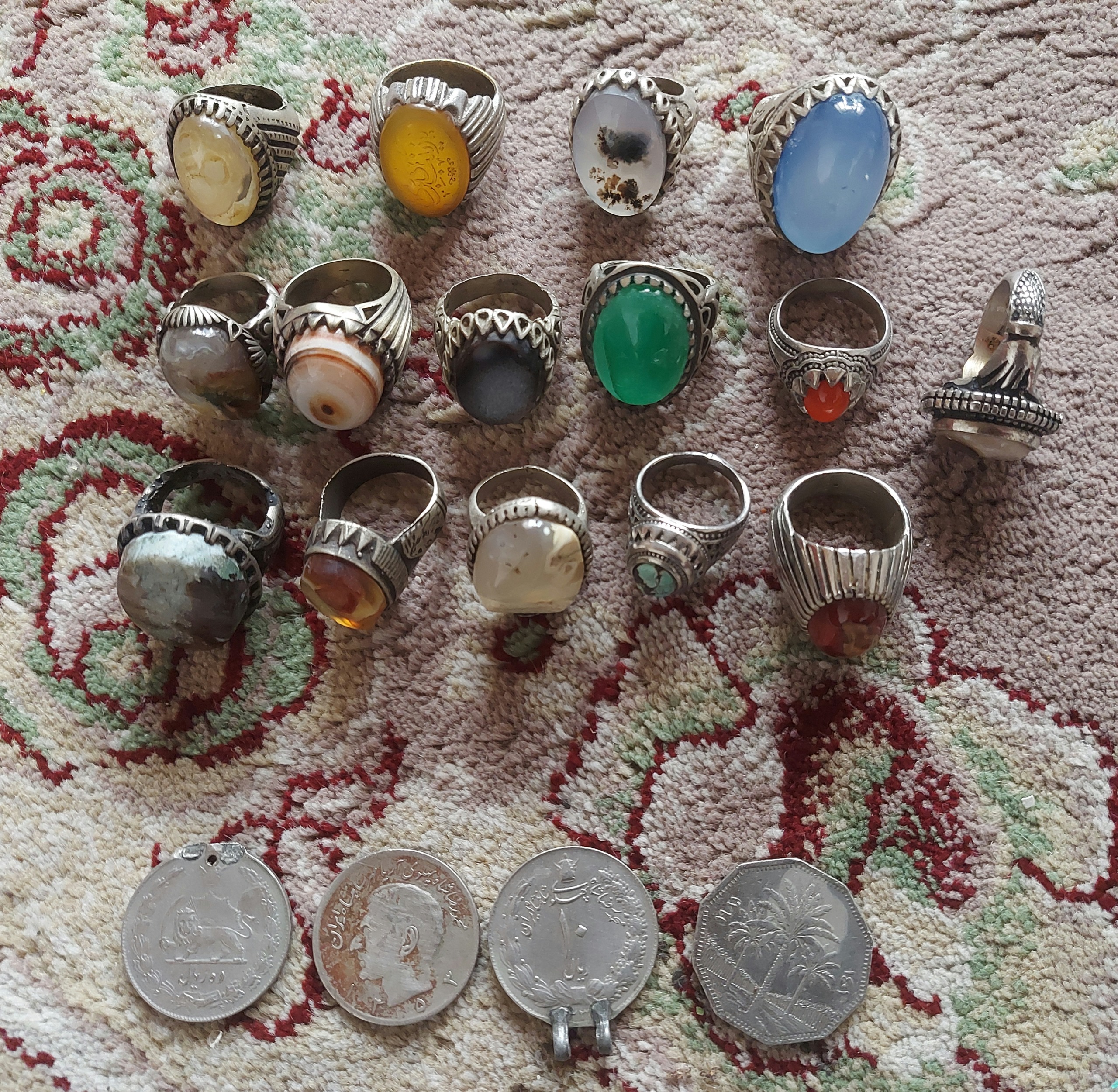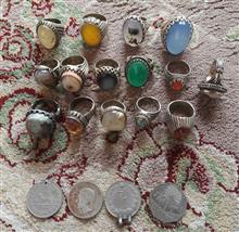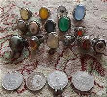تعدای انگشتر با سنگهای معدنی با سنگ عقیق،باباقوری تک چشم سفید خالدار،چند پوست خون بند ،آمیتیست ،حجرالسلطان و ...