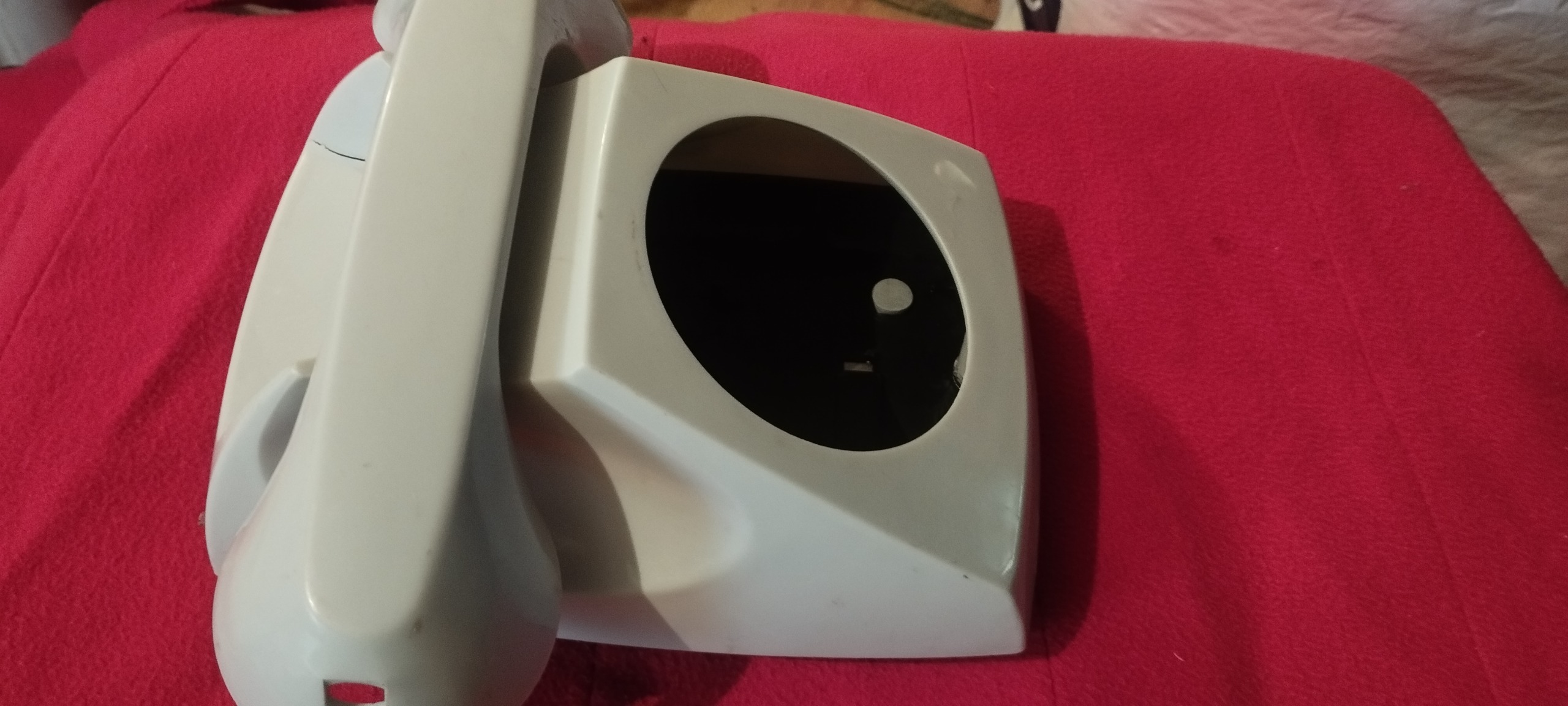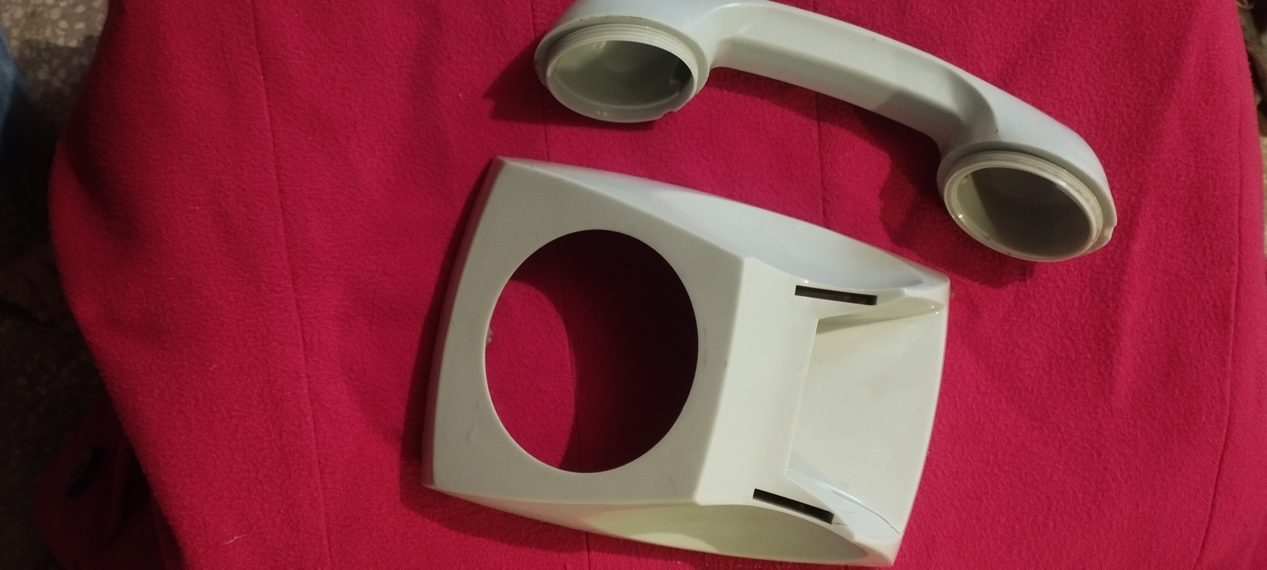 قاب تلفن قدیمی احتمالا روسی.شامل گوشی بدون درب گوشی و دهنی.قاب زیر و رو.ی شکستگی داره که با چسب رازی قابل ترمیمه.روی عکسها ضربه بزنید و زوم کنید تا جزییات رو بهتر ببینید.