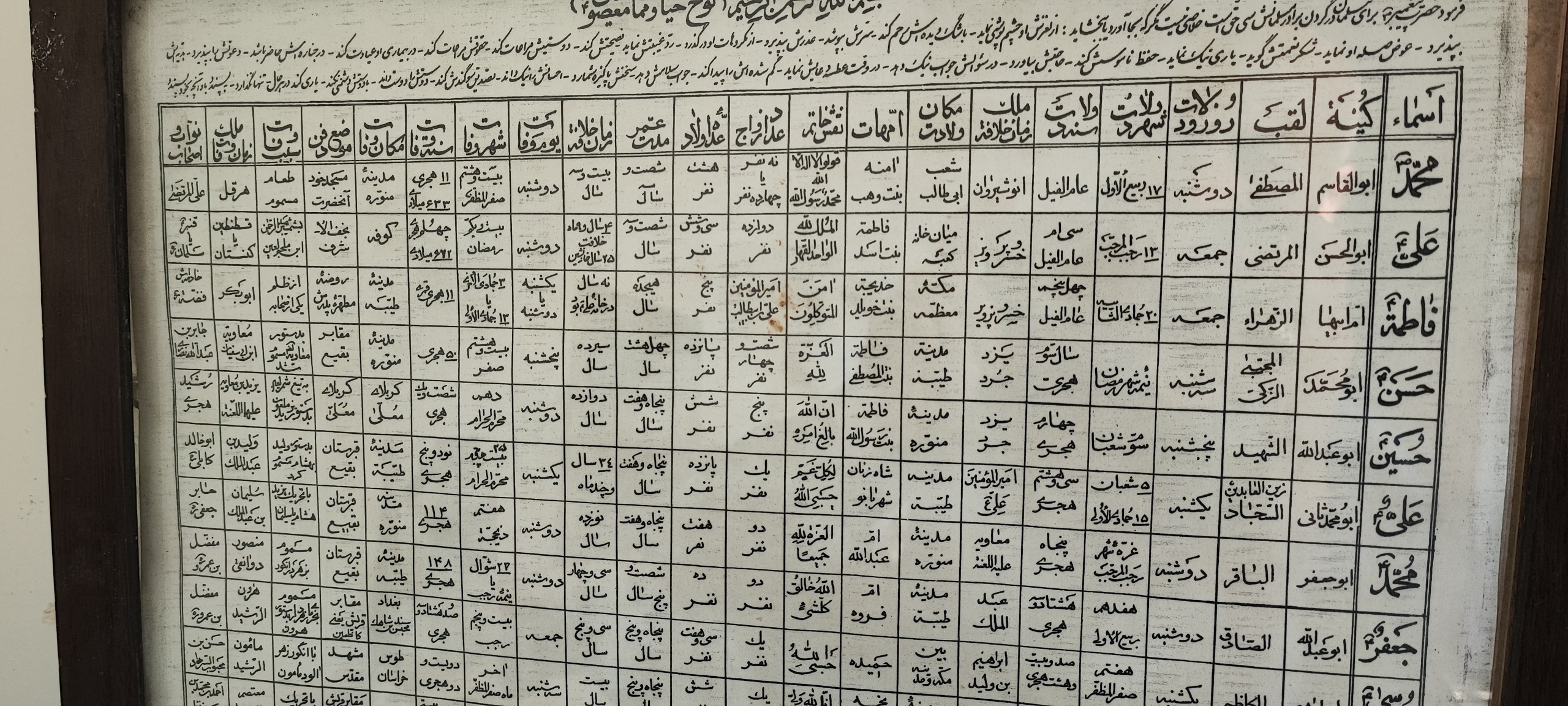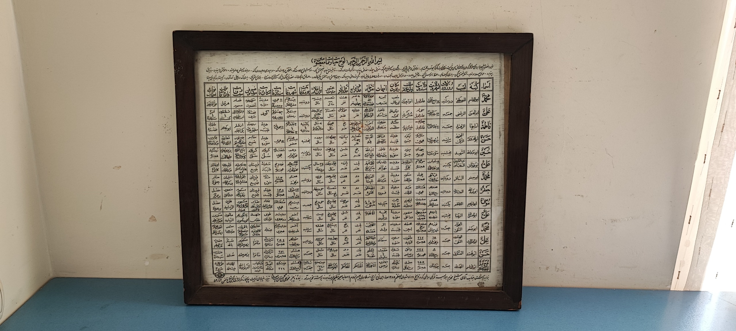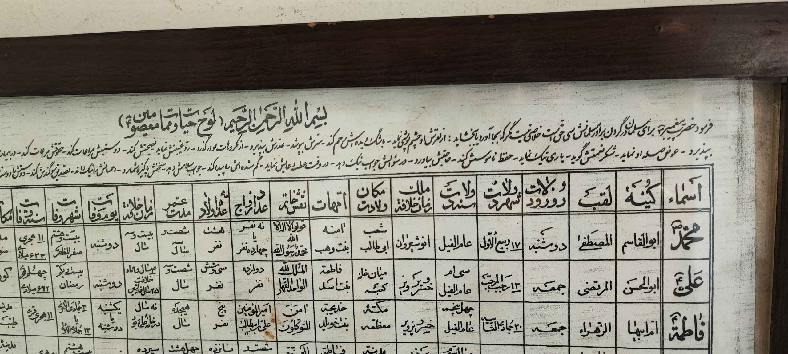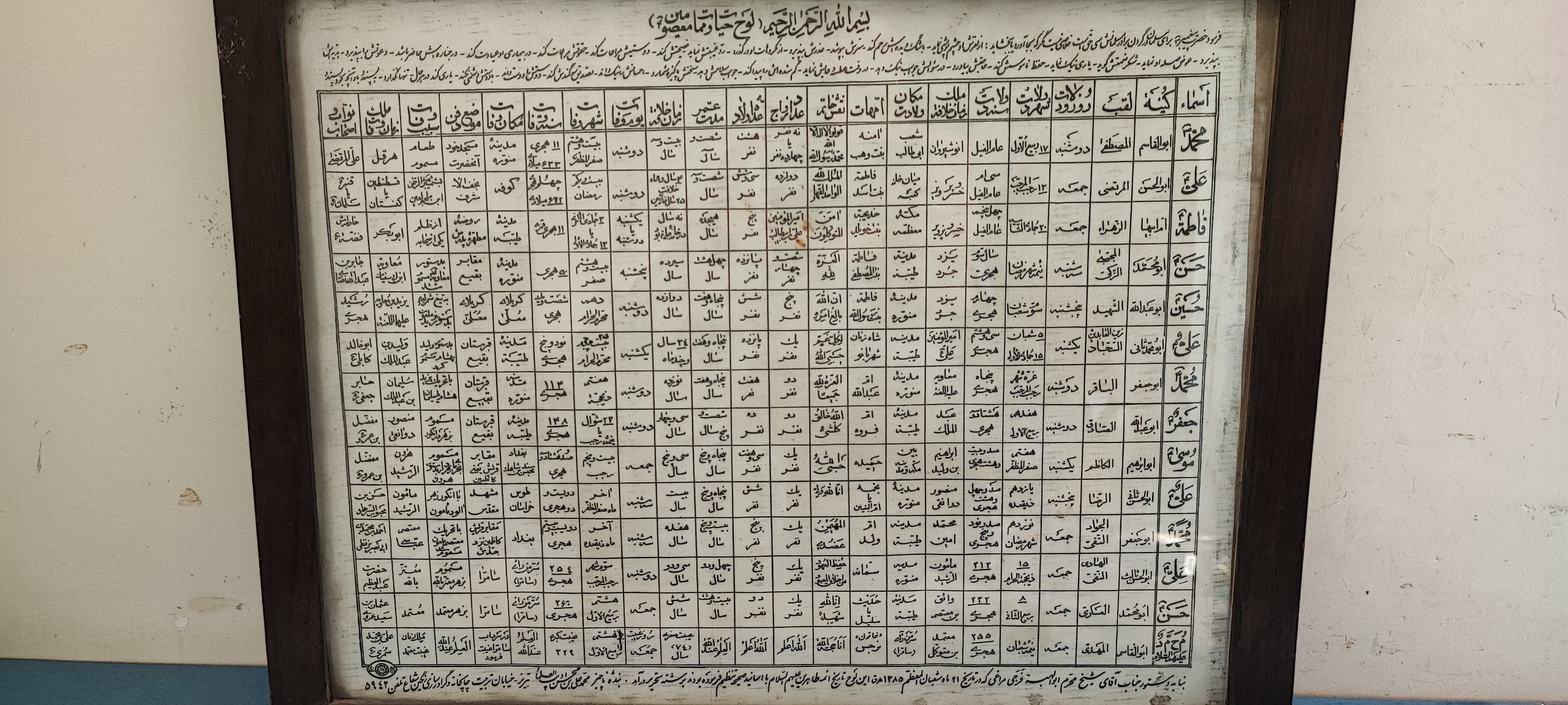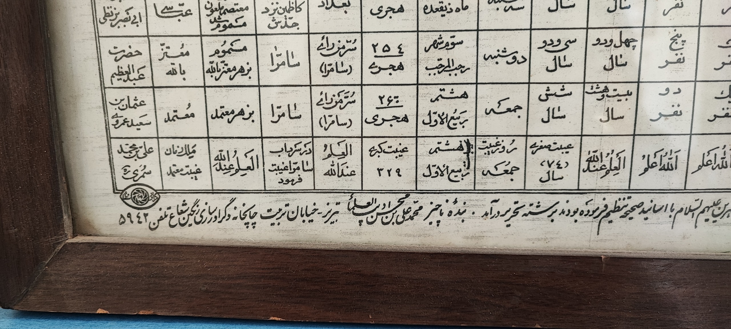 39×49 سانت ابعاد قاب، قاب چوبی قدیمی، چندین کتاب قطور در این لوح خلاصه شده، در قدیم چاپ شده است و نایاب، لوح شامل؛ اسماء، کنیه، لقب، روز ولادت، ملک زمان ولادت، مکان ولادت، امهات، نقش خاتم، عدد ازدواج، عدد اولاد و ...