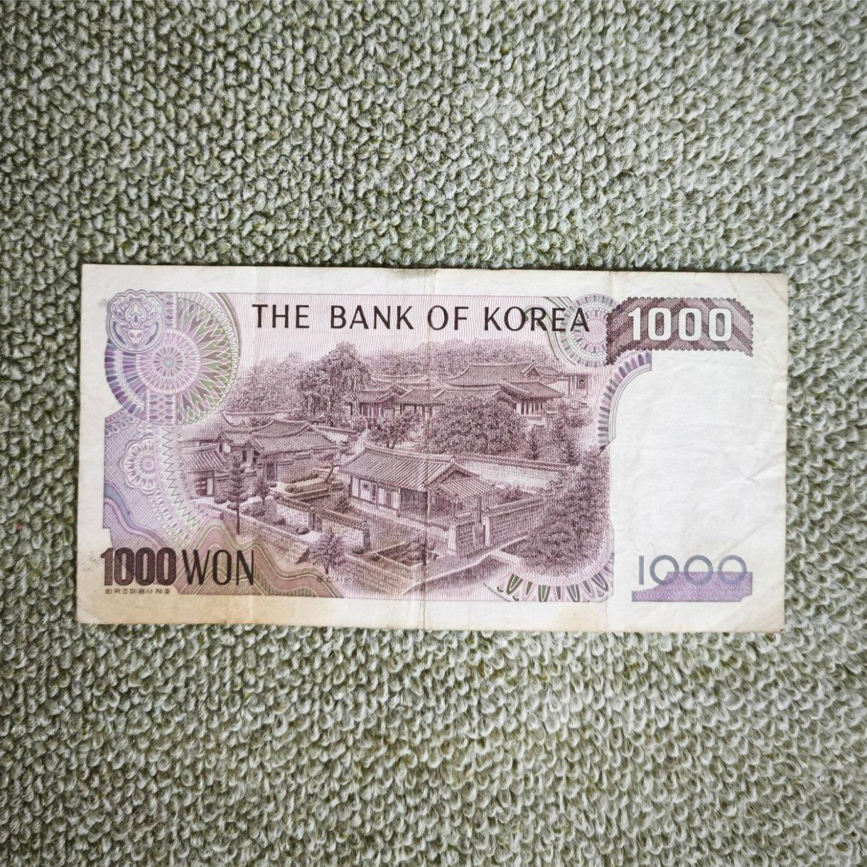 اسکناس 1000 وون کره ی جنوبی سری 1983 میلادی با تصویری از یی هوانگ دانشمند نئوکنفوسیانیسمی مشهور کره بر روی اسکناس و دانشکده دوسان سوون در آندونگ کره جنوبی. اسکناس مطابق تصویر و بدون پارگی و خط خوردگی خودکار است.