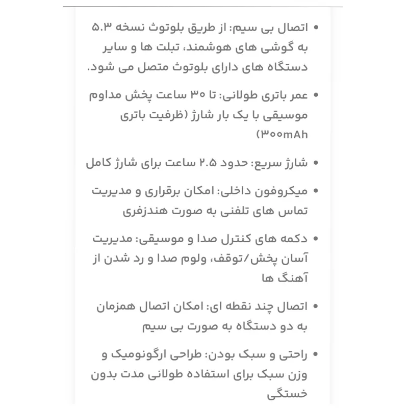 هندفری با قابلیت یک بار شارج 30 ساعت پخش موزیک دارد و با بلوتوث وصل میشود وهم زمان به دو گوشی یا دستگاه وصل میشود صدای واضح و برای تماس و پاسخ دادن و کم و زیاد کردن صدا و همه دارای یک هندفری خود میخواد دارد از دست ندید عالی هست