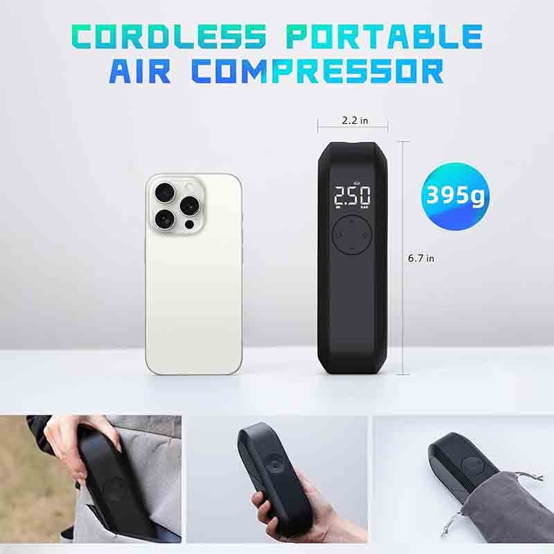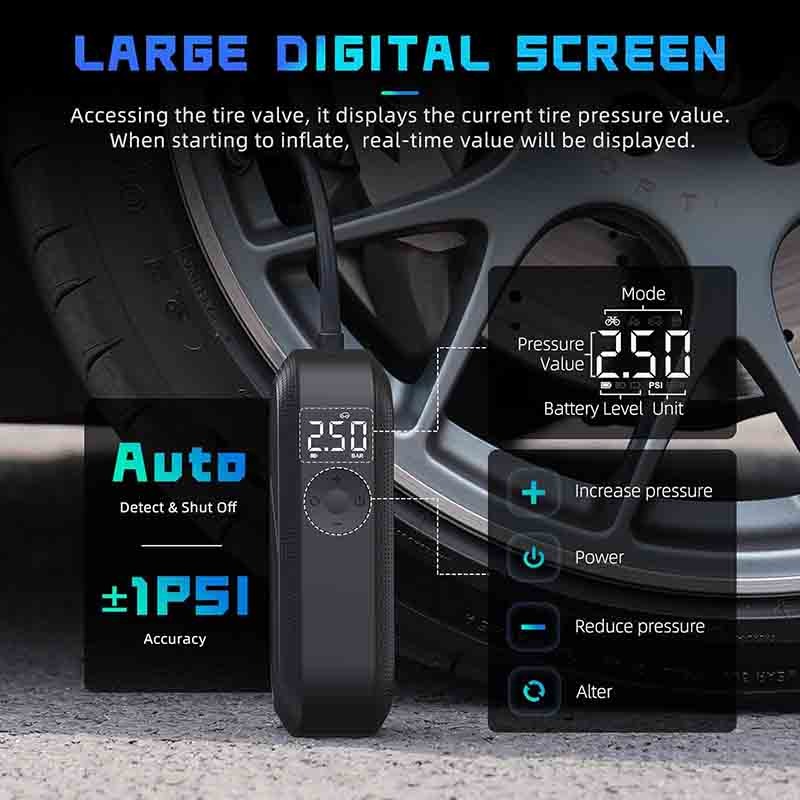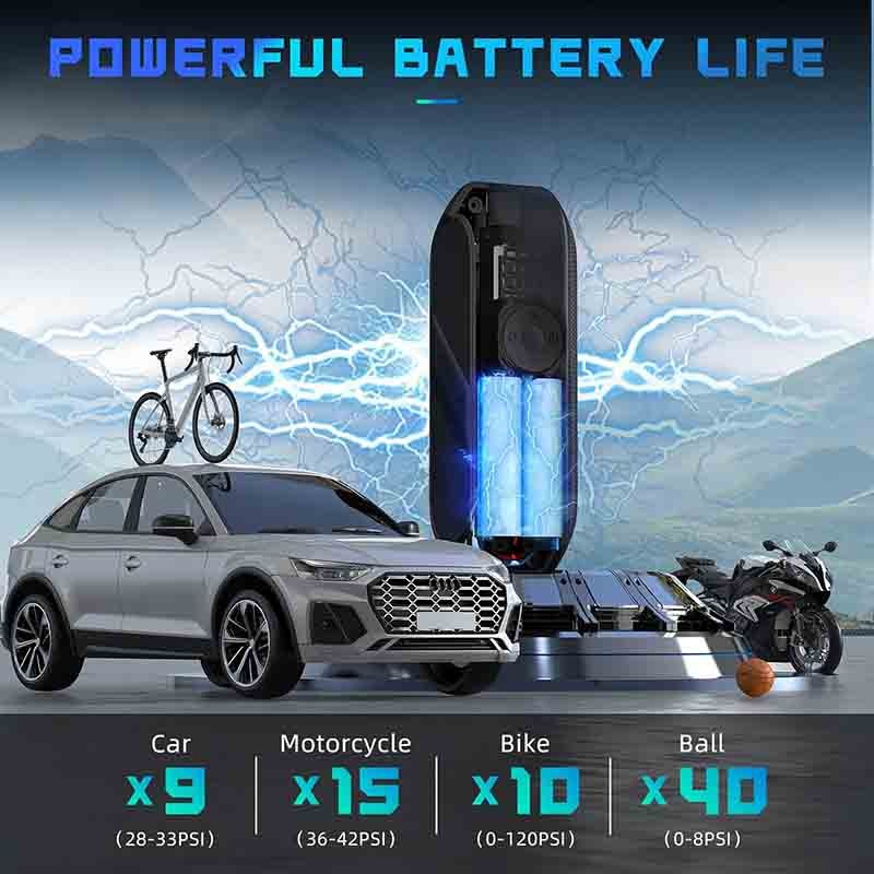 کمپرسور هوای سریع: این کمپرسور هوای قابل حمل فشار 150 PSI و جریان هوای 20 لیتر در دقیقه را میدهد. در صورت شارژ کامل، کمتر از 2 دقیقه طول میکشد تا یک تایر ماشین 195/65R15 از 29 PSI به 36 PSI باد شود و کمتر از 90 سال طول میکشد تا یک تایر دوچرخه کوهستان