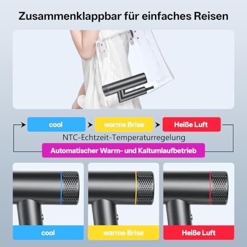 سشوار حرفه ای CONFU مدل Ionic 1700W سبک، تاشو، کم صدا، دارای پخش کننده مغناطیسی، نازل حالت دهنده، کابل بسیار بلند، مناسب برای منزل، سالن آرایش و مسافرت