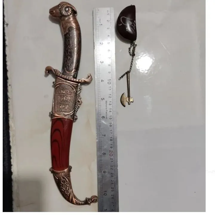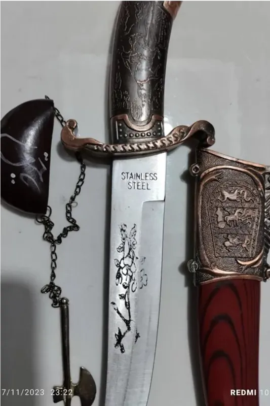 چاقوی دکوری بسیار زیبا حدودا 30 سال پیش از زنجان خریداری شده وداخل دکور بوده ،تیغه استیل با نقش ونگار بسیار زیبا جنسشو نمی دونم .با کشکول وکوچکترین تبر زین برنزی