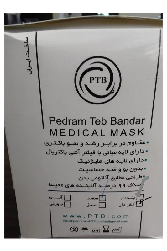 این ماسکها ساخت شرکت پدرام طب بندر است و 50 عددی است و مدلش از کشدار های دور گوش هست و از این دست سازها و کارگاهیها نیست.تو عکسها مشخصه رنگ سفید هست