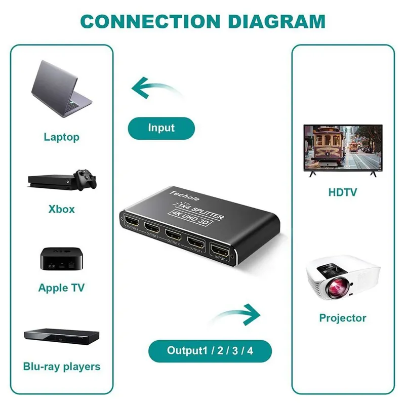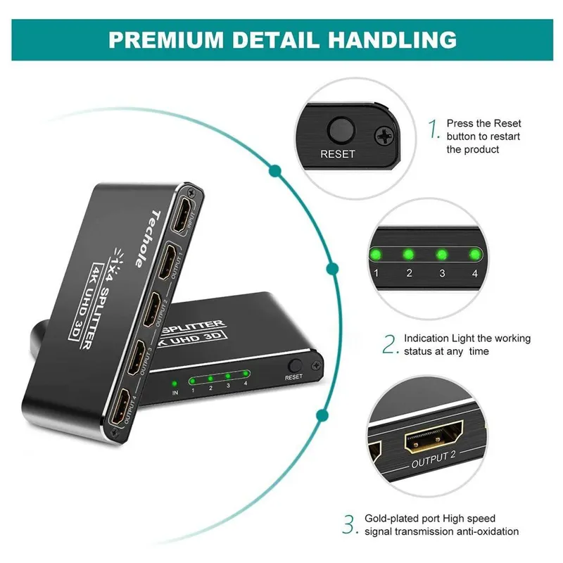 تصویر شفاف 4K - تقسیمکننده Techole 4K HDMI از نمایشهای سه بعدی، 4K x 2Kesam30hz، 1080P esam30hz، 1080P esam60hz میکند. می توانید مجلل ترین ویدیو و صدا را با دوستان یا خانواده خود به اشتراک بگذارید.