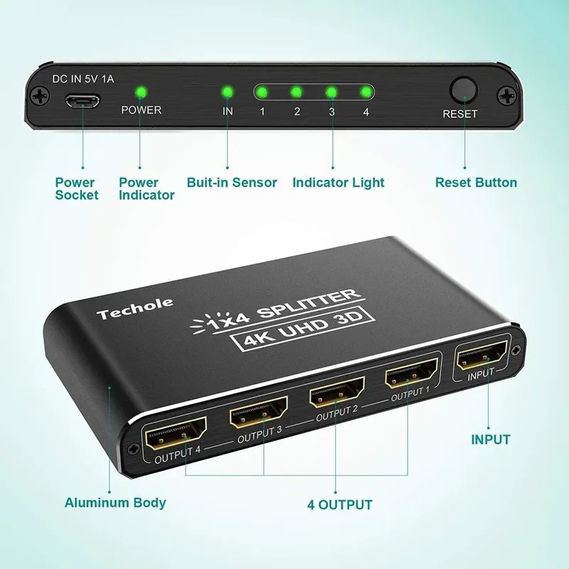 Aluminium HDMI splitter از یک منبع صوتی و تصویری را از منبع واحد به چهار نمایشگر HDMI به طور همزمان کپی می کند و ارائه های با کیفیت بالا و چشمگیر ایجاد می کند. بدون محدودیت، بدون فلاش یا کاهش وضوح .