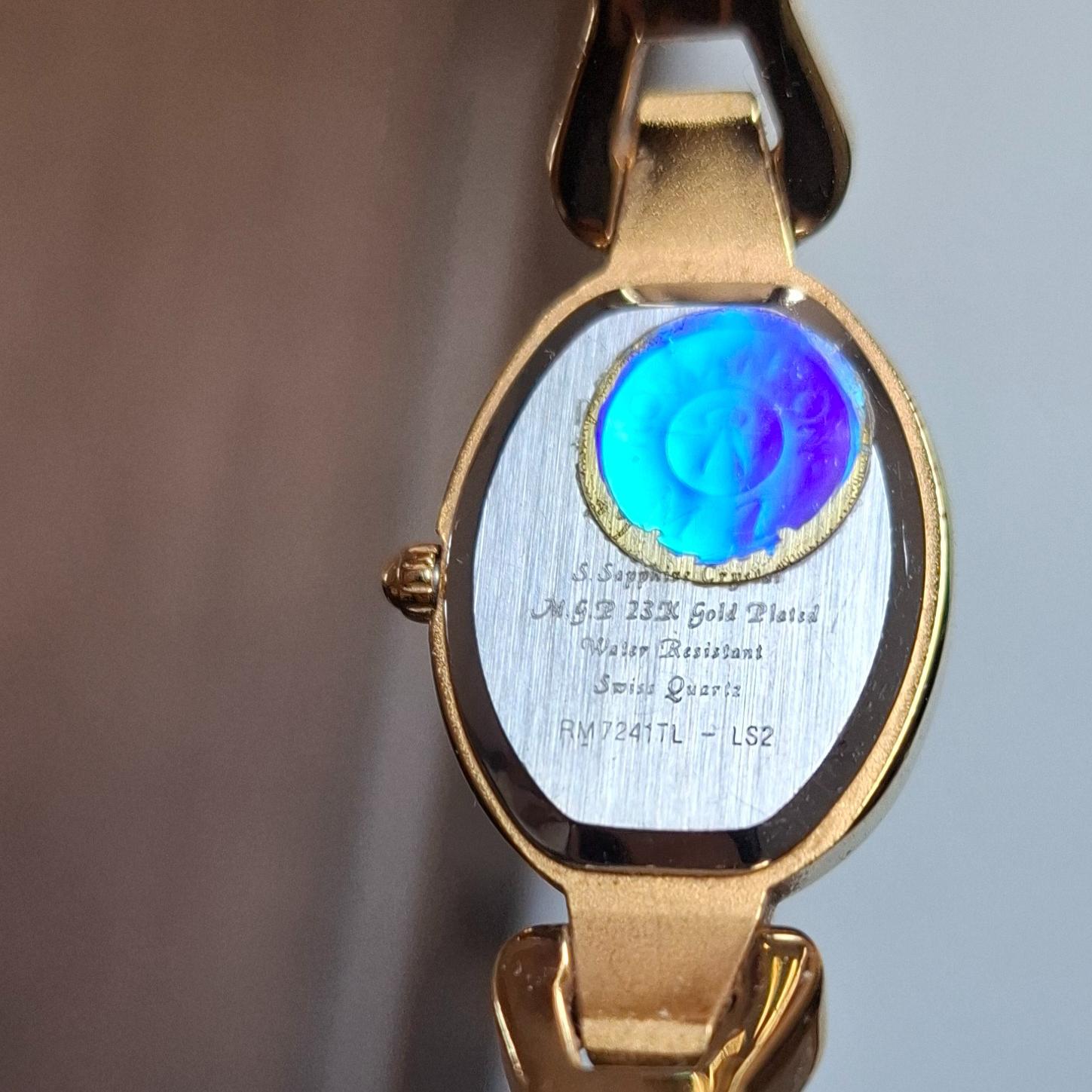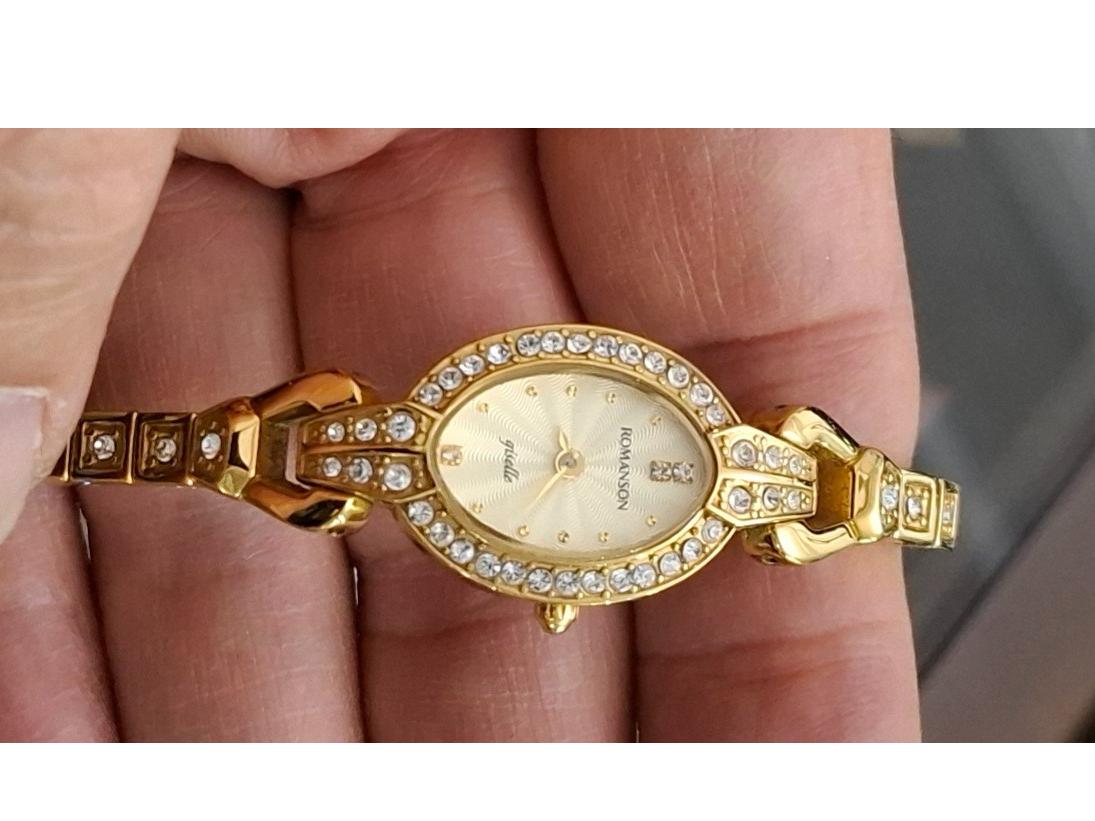 ساعت مچی زنانه رومانسون اصل سوئیس، طلایی دارای نگین روی بند و سه نگین روی صفحه بسیار زیبا، کاملا سالم.