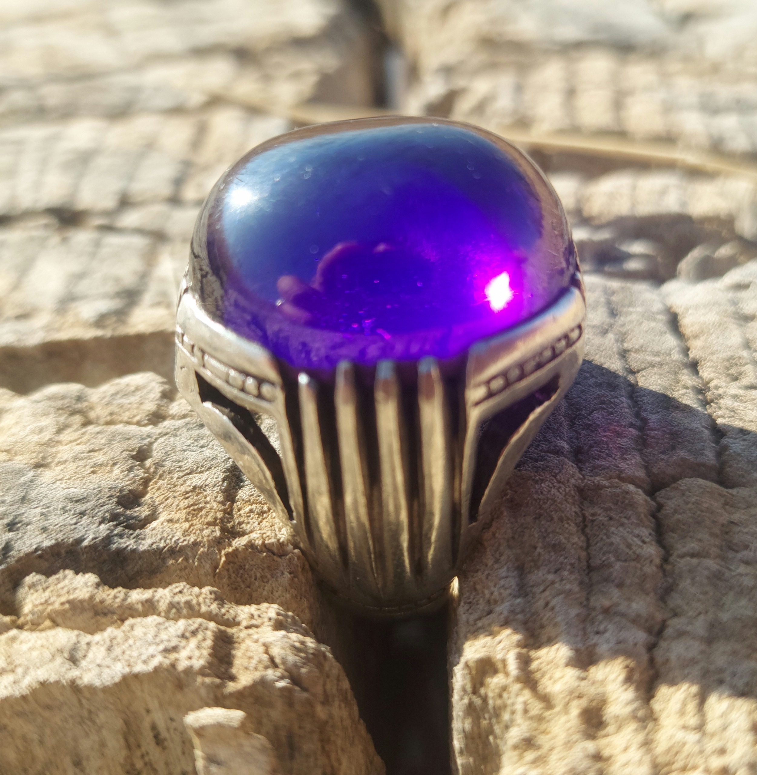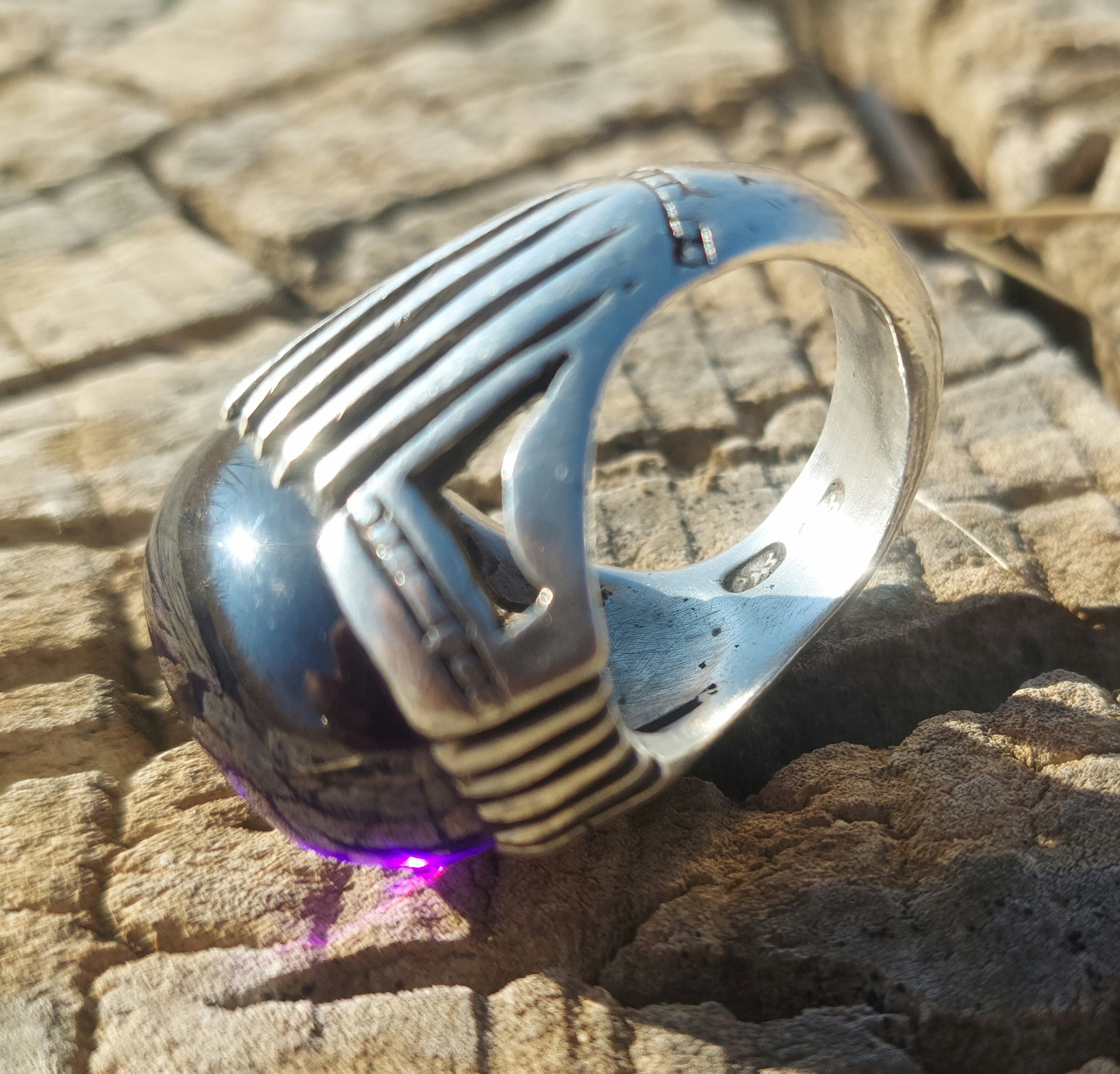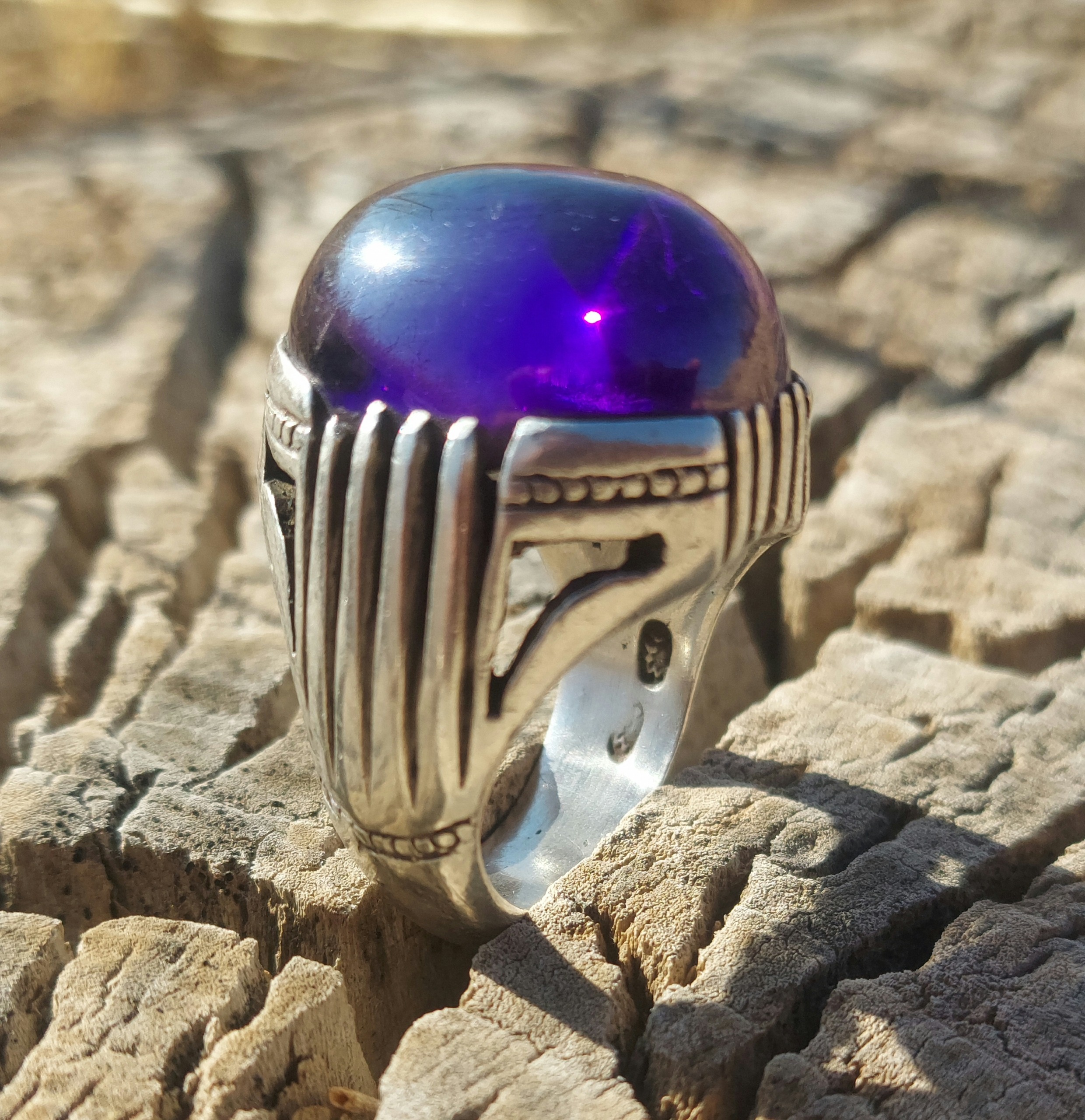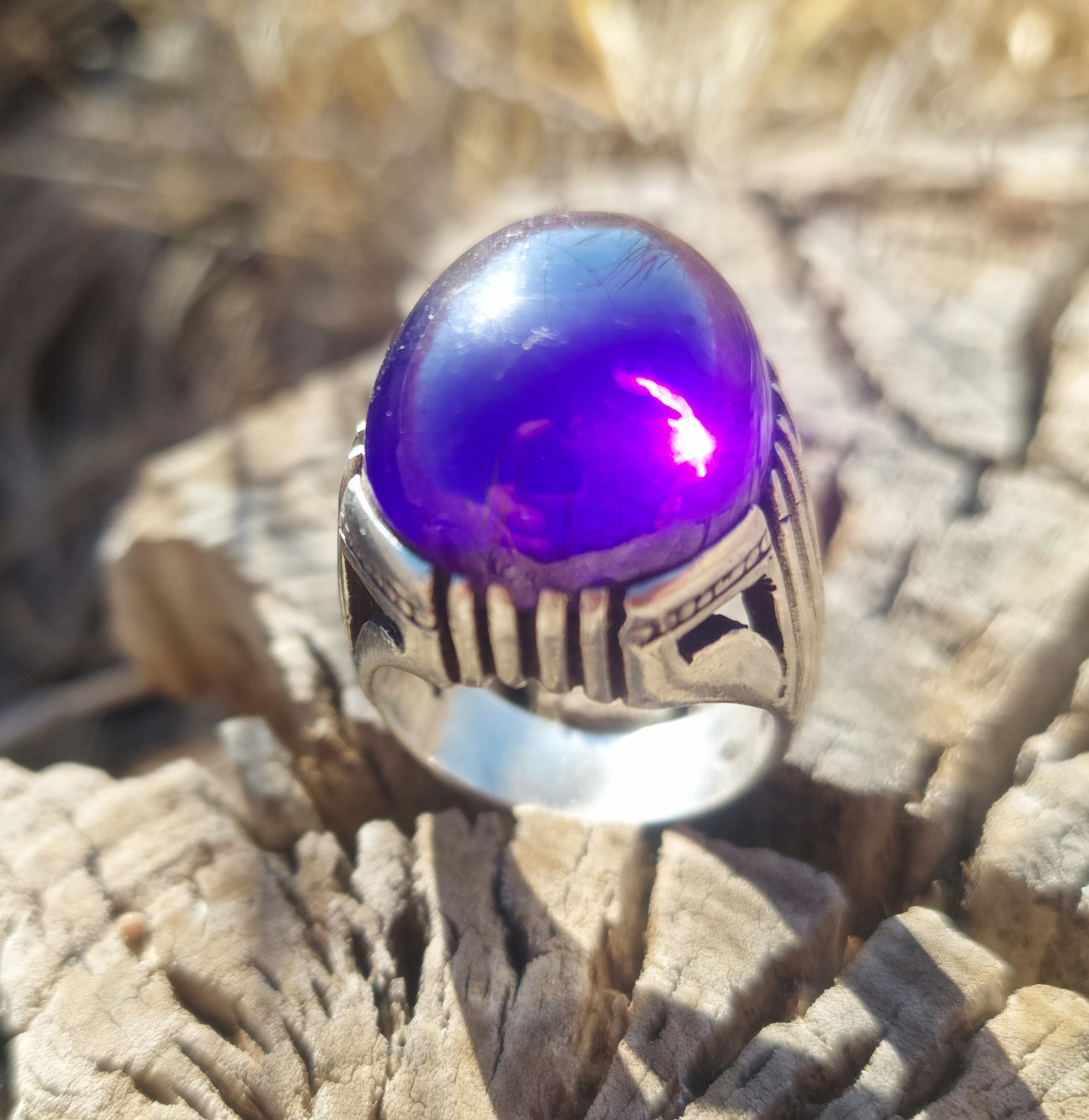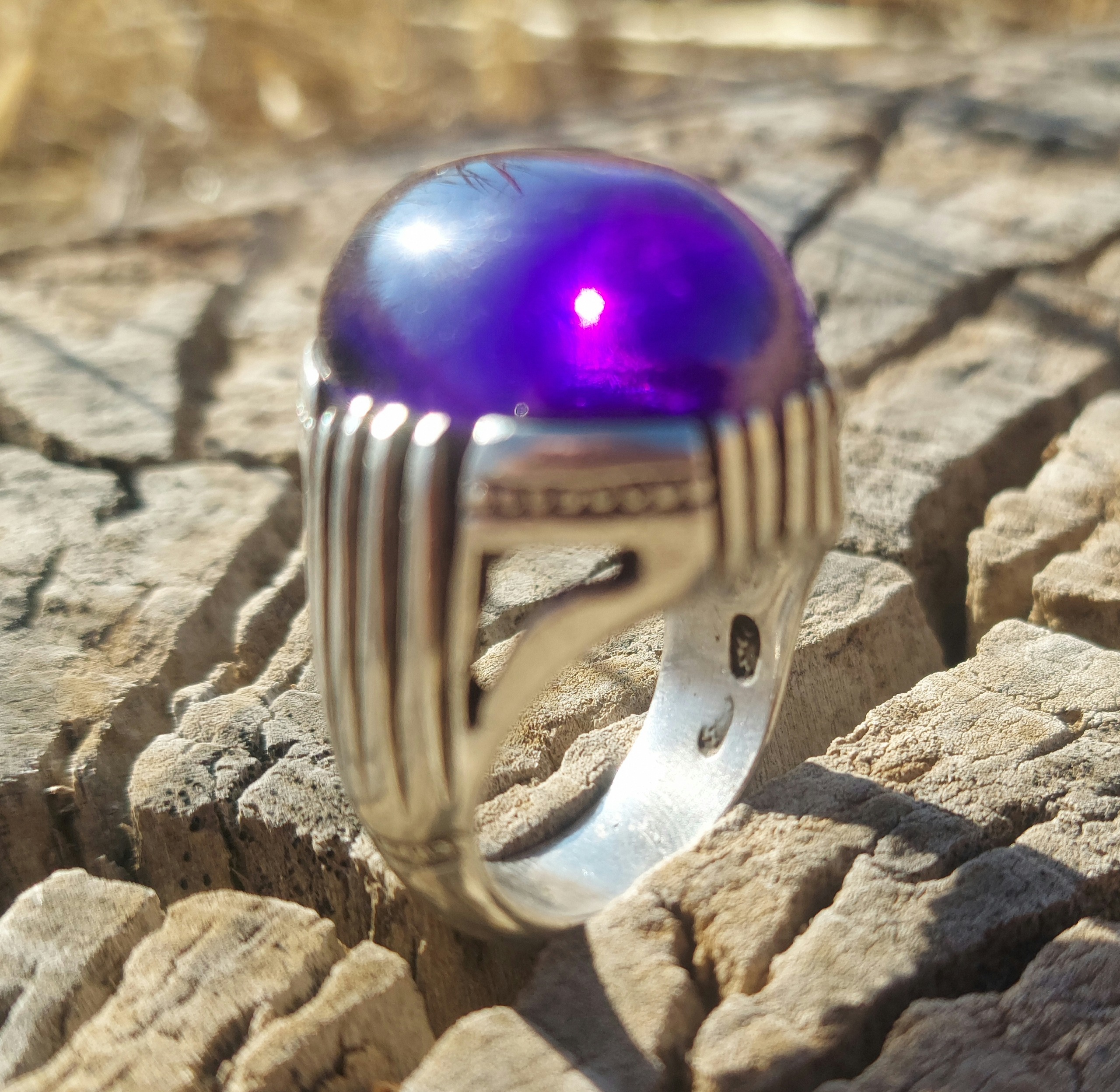 نگین بنفش آمتیست جیلی روی رکاب نقره دستساز، زیر نور خورشید مثل قطرهای از جادوی ارغوانی میدرخشد.