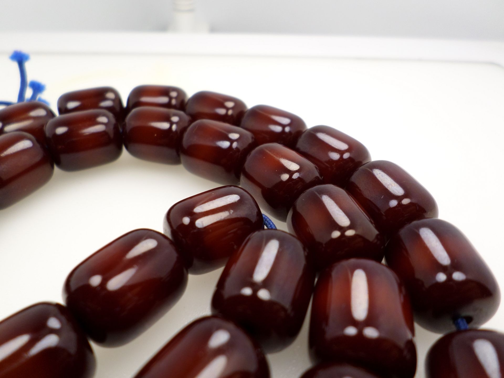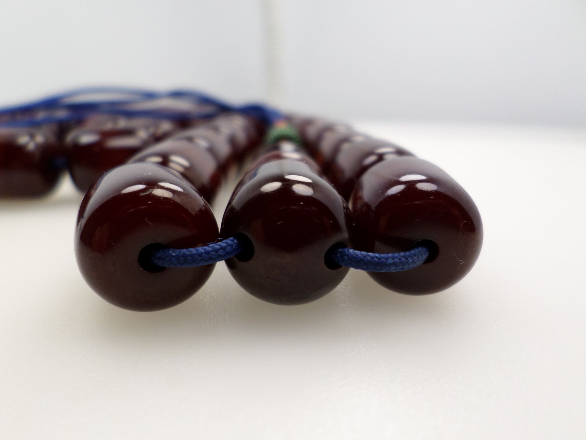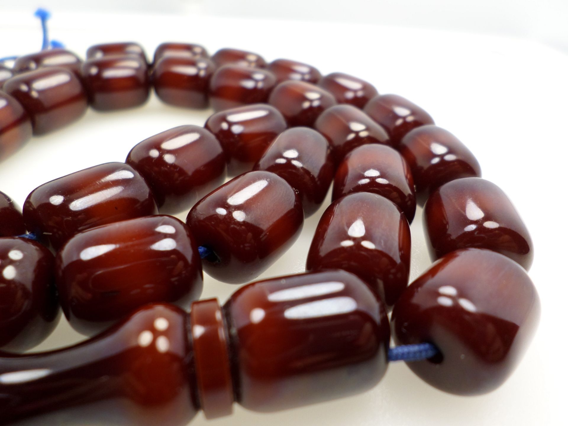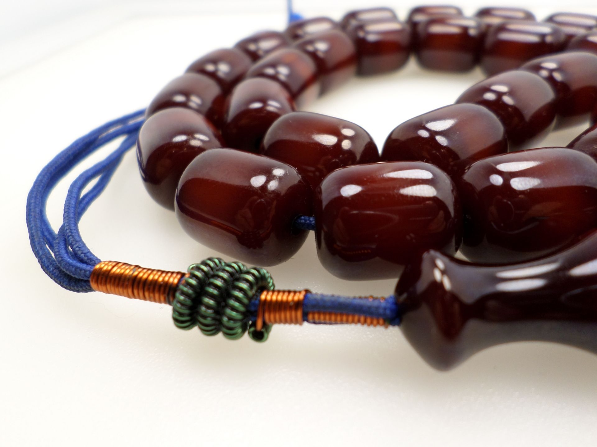 دانهها با خواب بارخونهای بالا و کامل رنگ آمده  و رنگ سرخ عثمانی این تسبیح جلوهای خاص و کلکسیونی به آن بخشیدهاند.