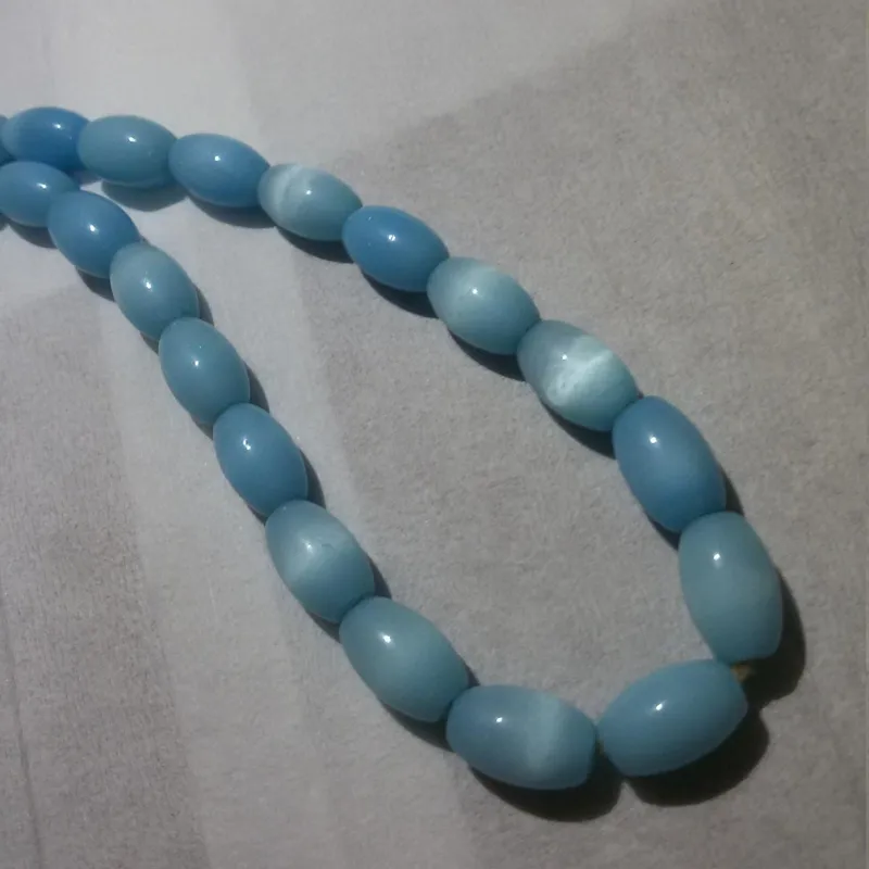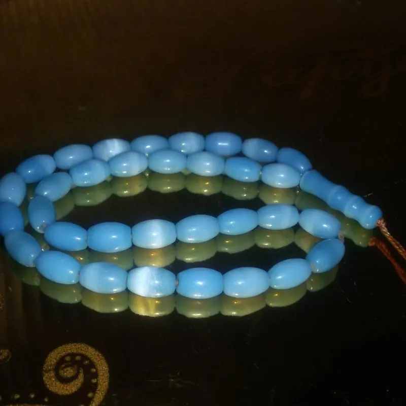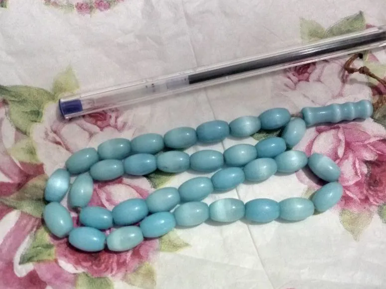 تسبیح چشم گربه ای درشت آبی آسمانی 33 عددی طبق تصاویر....لطفا باتوجه به تصاویر خرید کنید....تسبیح از سنگ معدنی است و روی شیشه خط می اندازد.چشم گربه ای های معمولی روی شیشه لیز میخورند.هر تستی که ثابت کنه سنگ معدنی هست رو بفرمایید تا انجام و نتیجه رو اعلام کنم خدمتتون تا در اصل بودن سنگ تسبیح اطمینان حاصل کنید