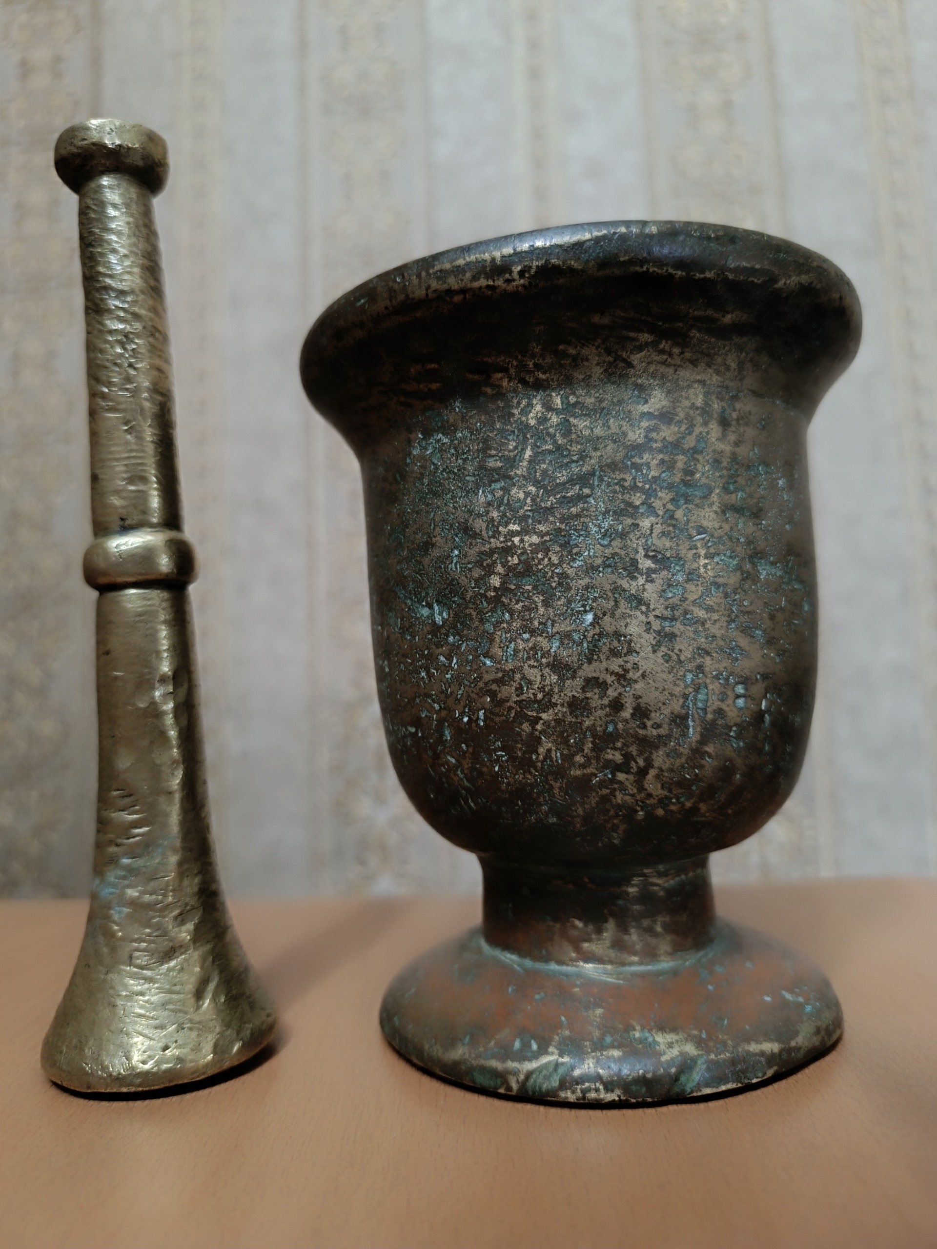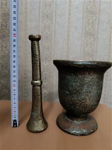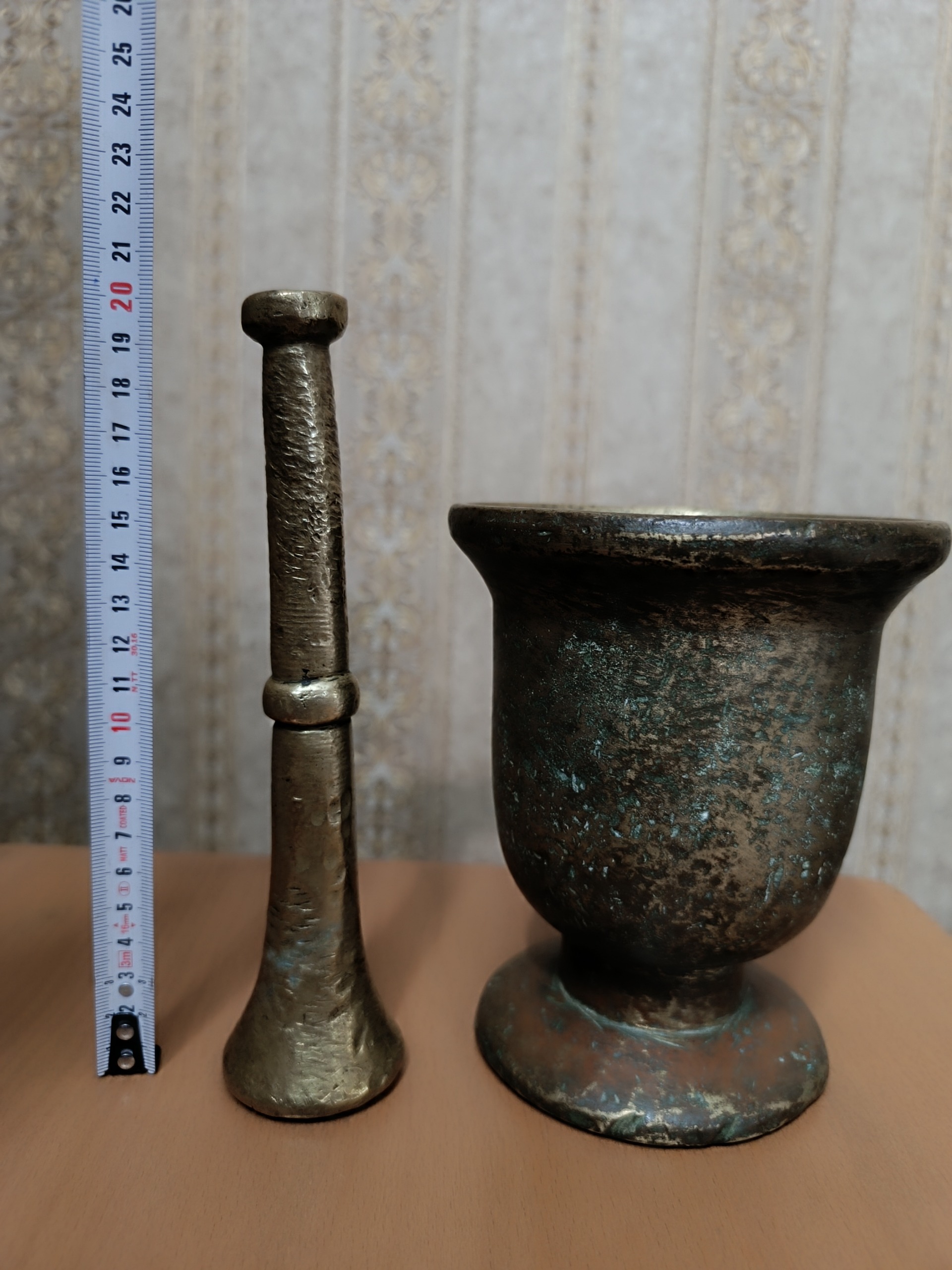 یک عدد هاون روسی قدیمی ، پایه دار ، جنس برنج ، کیفیت و ابعاد مطابق تصویر ، وزن تنه سه کیلو و وزن دسته 800 گرم ، داخل تخت نیست و کمی انحنای داخلی هم در قسمت وسط و هم در لبه های داخلی داره که این دلیلی بر هنر صنعتگران قدیمی داره که به هنگام استفاده هیچ ذره ای در کنارههای هاون نمی مونده و بخاطر همون انحنا کل مواد در وسط کار جمع میشدند ، یه کار آنتیک که حتی کاربردی هم خواهد بود.