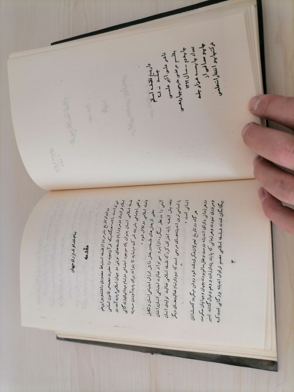 حاشیه چند ورق نخست کمی رطوبت دارد، جلد اول شناسنامه ندارد.