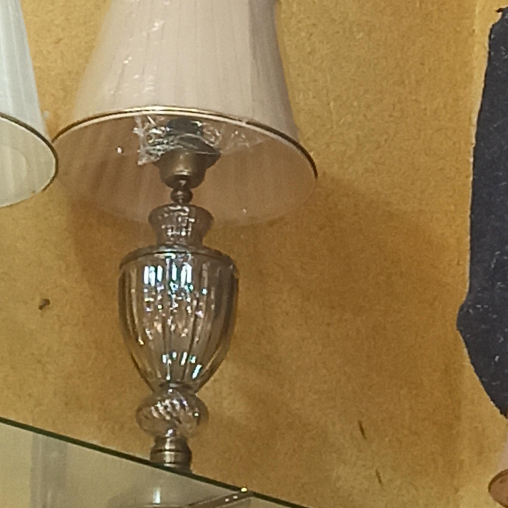 آباژور رومیزی ستون بلور شامپاینی در دوطرخ راه راه و لوزی پایه فلزی رنگ آنتیک