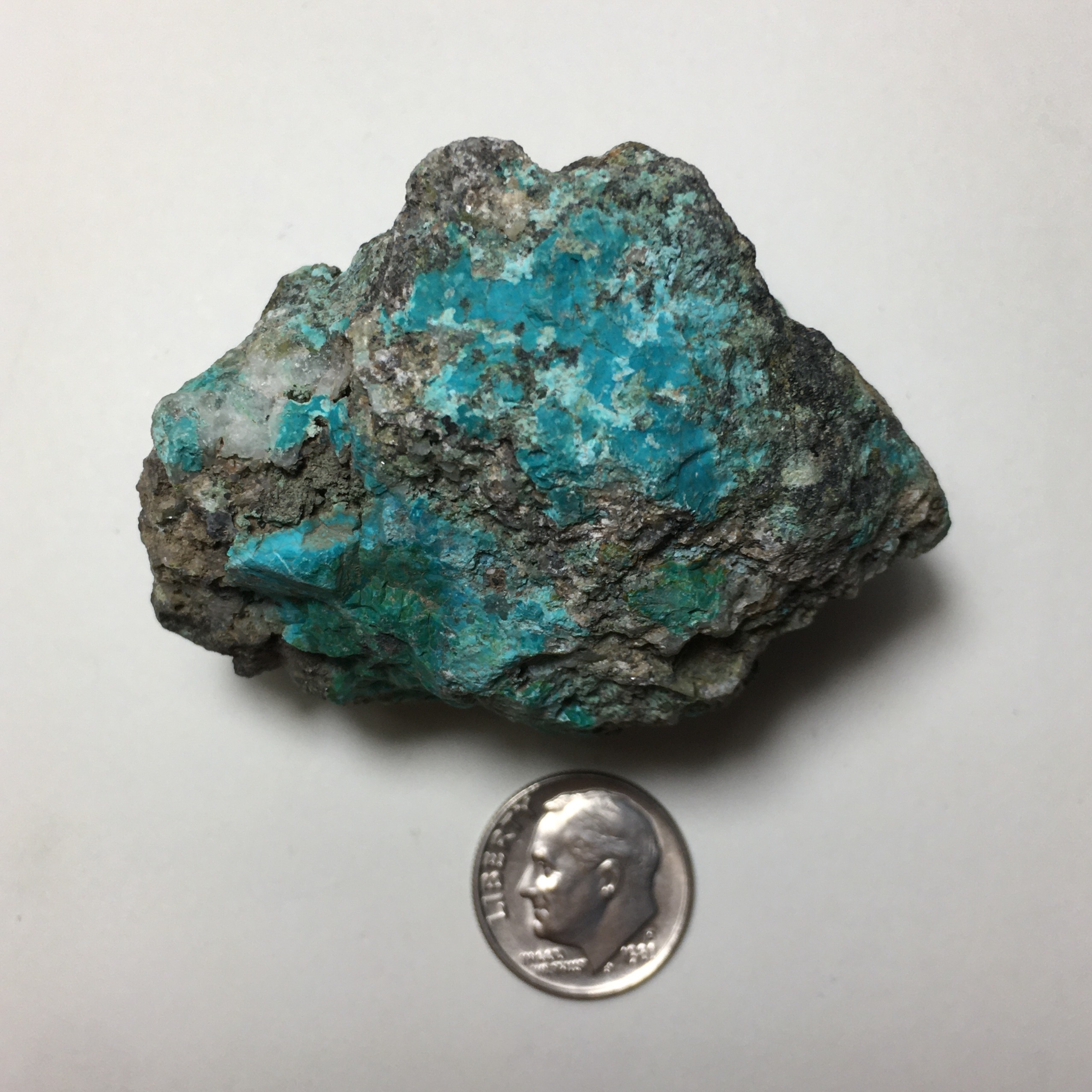رنگ آبی-فیروزه ای زیبا با رگه های سبز و بافت شکننده و طبیعی، همراه با کوارتز .