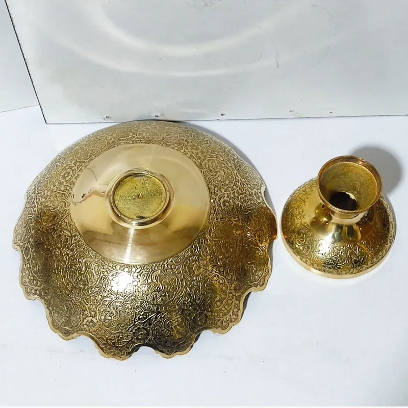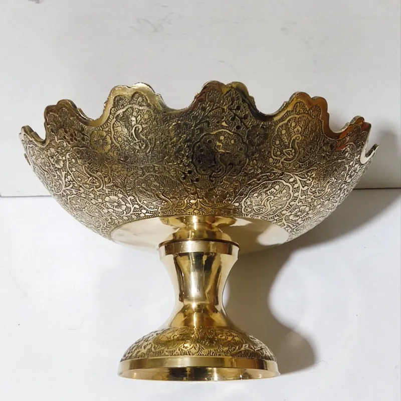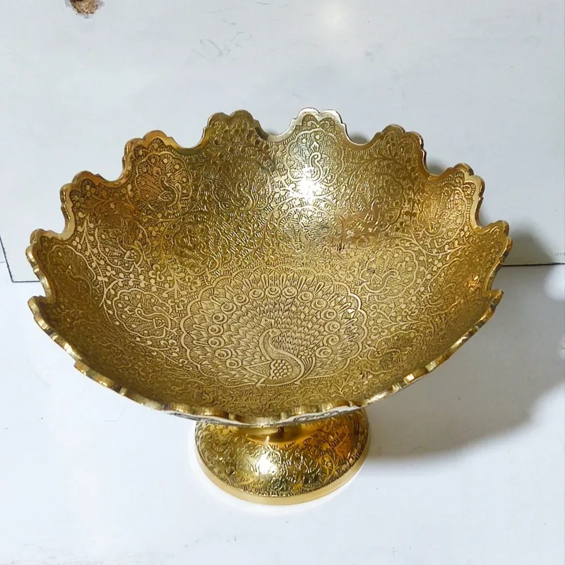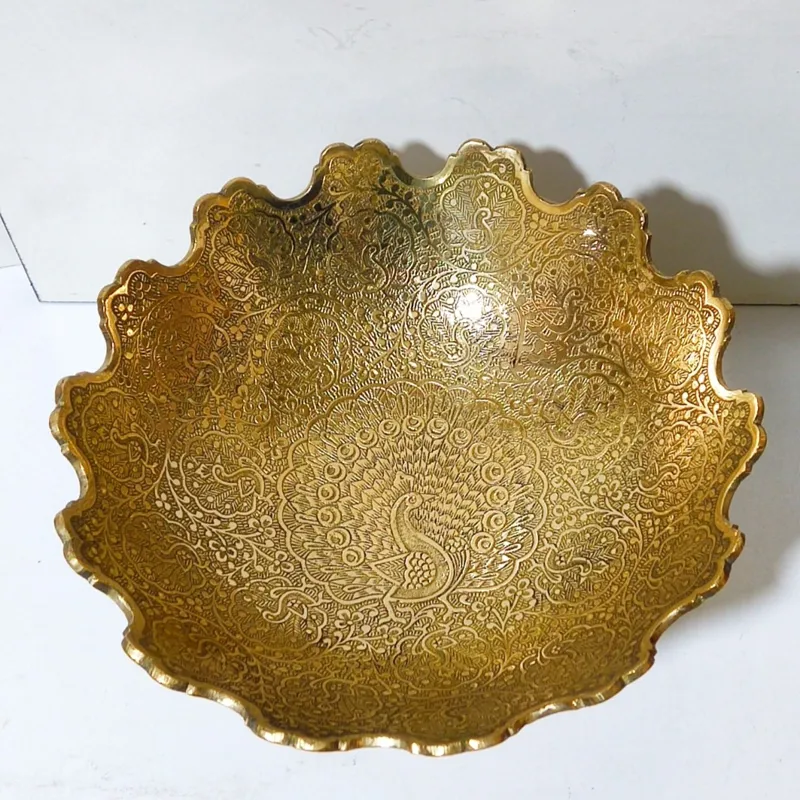 آجیل خوری تمام برنجی دو تکه ساخت هند با قطر 24 سانتیمتر مدل لبه قلعه طرح طاووس با سطح کیفیتی درجه یک بسیار زیبا و مناسب استفاده دائم و طولانی مدت بدونه تغییر رنگ و قابل شستشو بدون تغییر رنگ