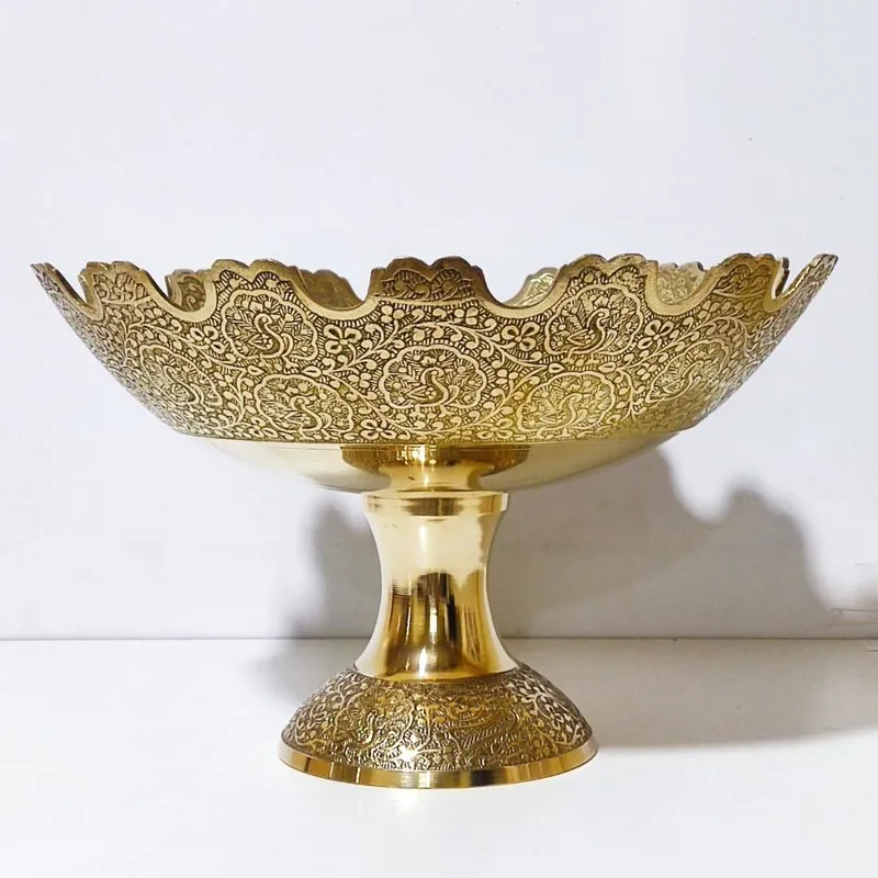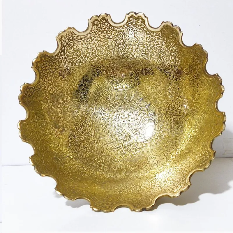 میوه خوری و آجیل خوری تمام برنجی ساخت هنوستان با قطر 28 سانتیمتر مدل لبه قلعه تمام قلم دست و دو رو کار شده با طرح طاووس و سطح کیفیتی درجه یک بسیار زیبا و مناسب استفاده دائم و طولانی مدت بدونه تغییر رنگ و قابل شستشو بدون تغییر رنگ