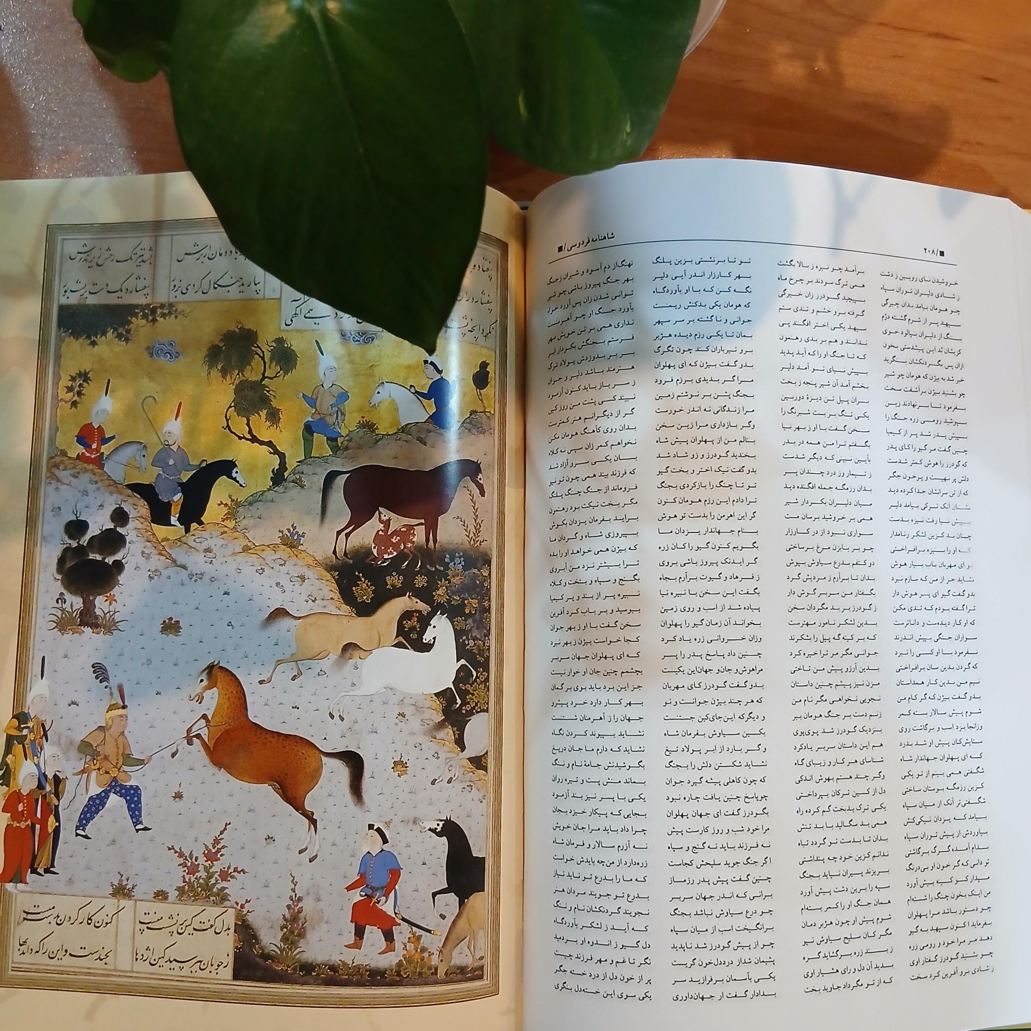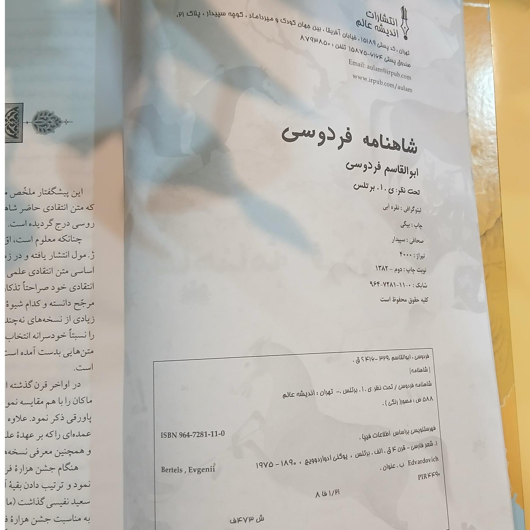 یک جلد شاهنامه فردوستی از روی نسخه مسکو چاپ سال 82 . مدتها در کتابخانه بوده یک گوشه طبق تصویر دوم چین خفیف پیدا کرده ذکر کردم تا مدیون نباشم. الان یک دفتر 200 برگ سفید 300 هزار تومانه . این کتاب که زینت کتابخونه ست . من یک جلد البته قطع کوچکترش هم دارم اینو گذاشتم برای عرضه .1960 گرم هم وزن داره با این حال پستش هم متقبل میشم .