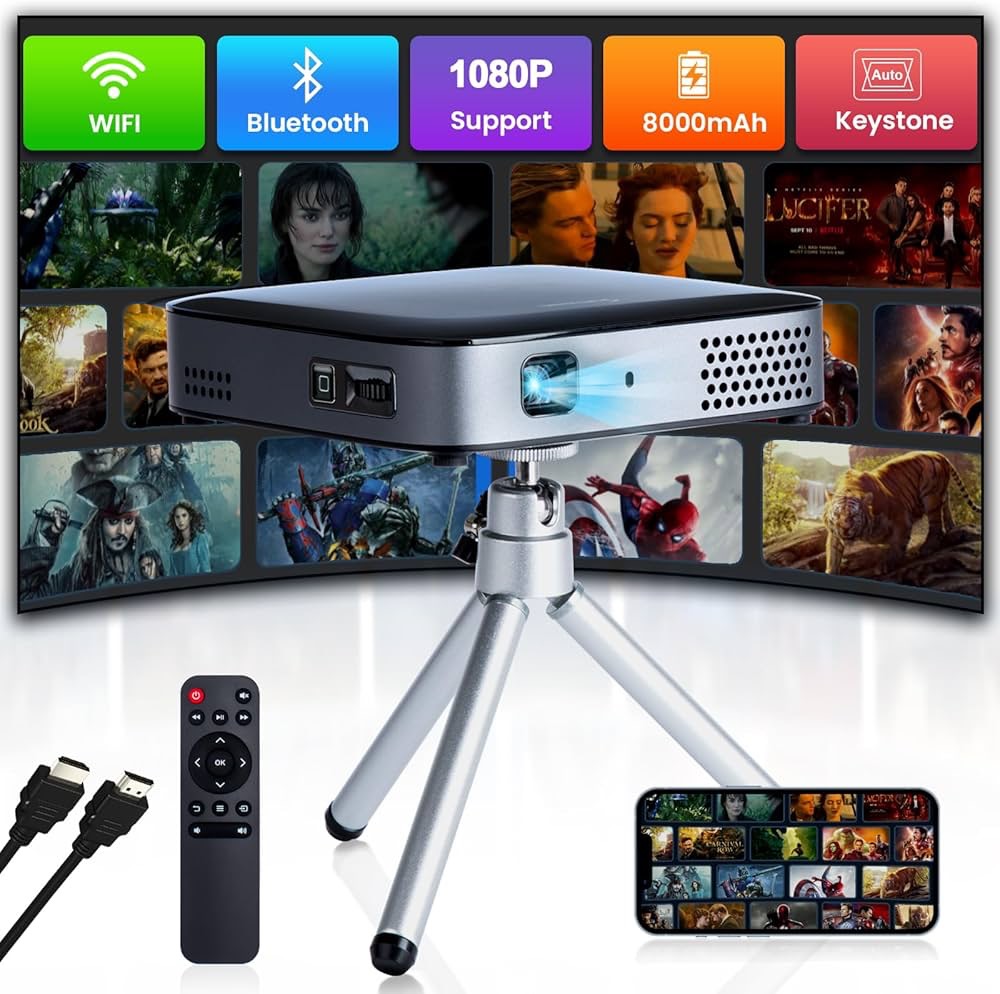 پروژکتور قابل شارژ: این مینی پروژکتور قابل حمل دارای یک باتری داخلی 8000 میلیآمپر ساعتی است که میتواند تا 3 ساعت پخش کند، بنابراین میتوانید حتی در هنگام کمپینگ، مسافرت یا سفرهای جادهای، آزادانه از یک فیلم کامل لذت ببرید. به لطف اندازه کوچک (4.7 x 4.7 x 1.1 اینچ) و طراحی فوقالعاده سبک (0.88 پوند)، میتوانید به راحتی پروژکتور باتریدار را در جیب خود قرار دهید. ما همچنین یک سهپایه چرخشی 135 درجه اضافی ارائه میدهیم که به شما امکان میدهد به راحتی از هر زاویهای، حتی روی سقف، فیلم پخش کنید. راحت و عالی برای شبهای دنج فیلم.