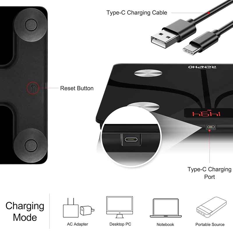 باتری قابل شارژ USB نوع C: در دنیایی که باتریها گرانها و تعویضهای آنها آزاردهنده است، ترازوهای قابل شارژ رونق گرفتهاند. ترازوی بدن بلوتوث RENPHO از شارژ USB-C و باتری داخلی بهره میبرد که در صورت شارژ کامل میتواند برای مدت طولانی مورد استفاده قرار گیرد.