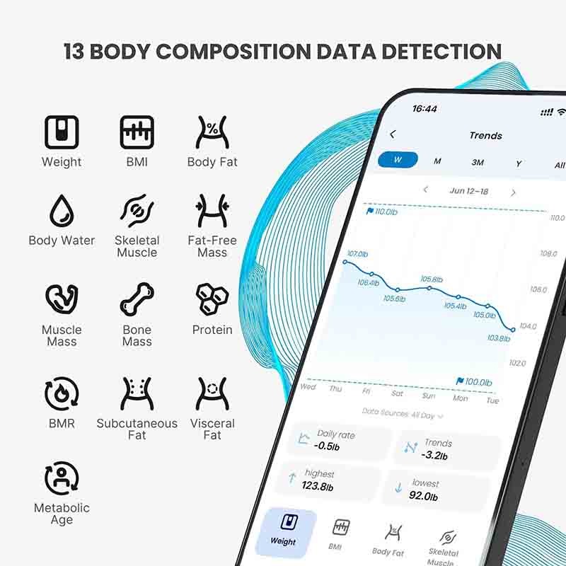 ترکری هوشمند: ترازوی BMI حمام RENPHO از برنامههای هوشمند برای تعیین اهداف، دادههای تاریخی و پیشرفت روزانه، هفتگی و ماهانه شما را میکند و هوشمندانه افزایش وزن و افزایش تناسب اندام شما را راصد میکند.