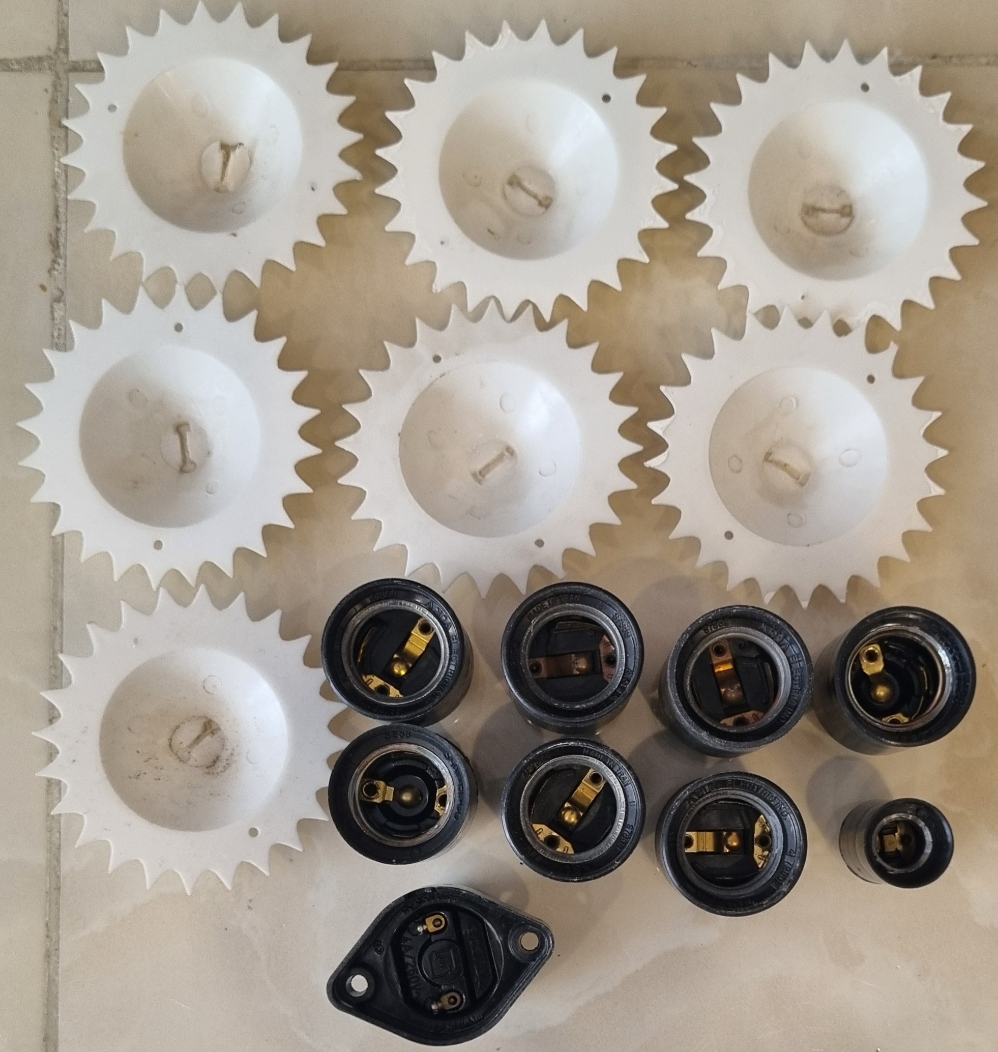 8 عدد سرپیچ لامپ معمولی به علاوه 1 عدد سرپیچ لامپ کوچک (مدل لوستری) به همراه 7 عدد سوراخ پوش پلاستیکی سیم برق به صورت یکجا و مطابق با تصاویر فروخته میشود