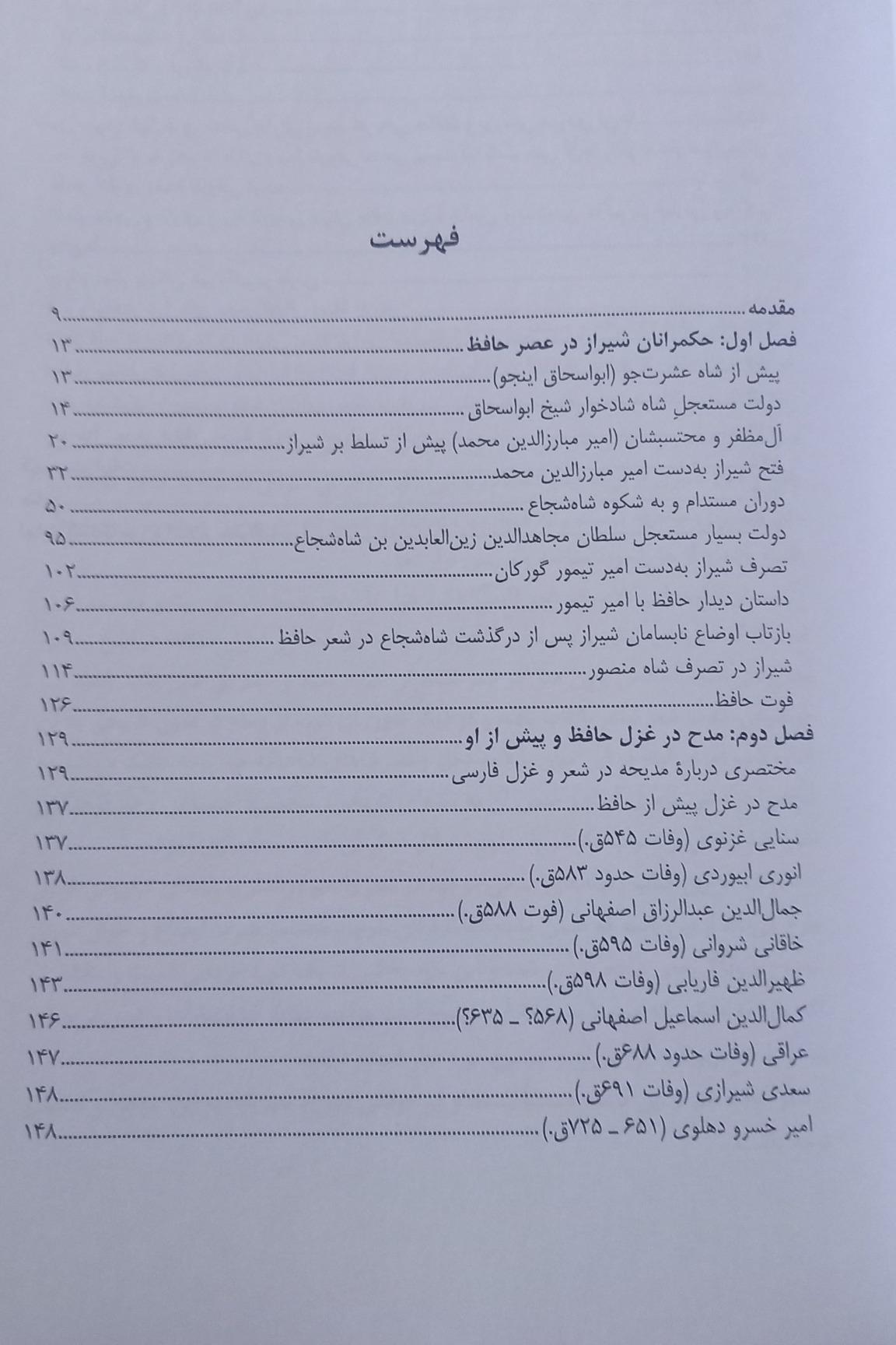 زمینههای تاریخی و مدحی در اشعار حافظ یک صفحه از فهرست کتاب رو در تصویر آوردم جلد شومیز قطع وزیری 284 صفحه