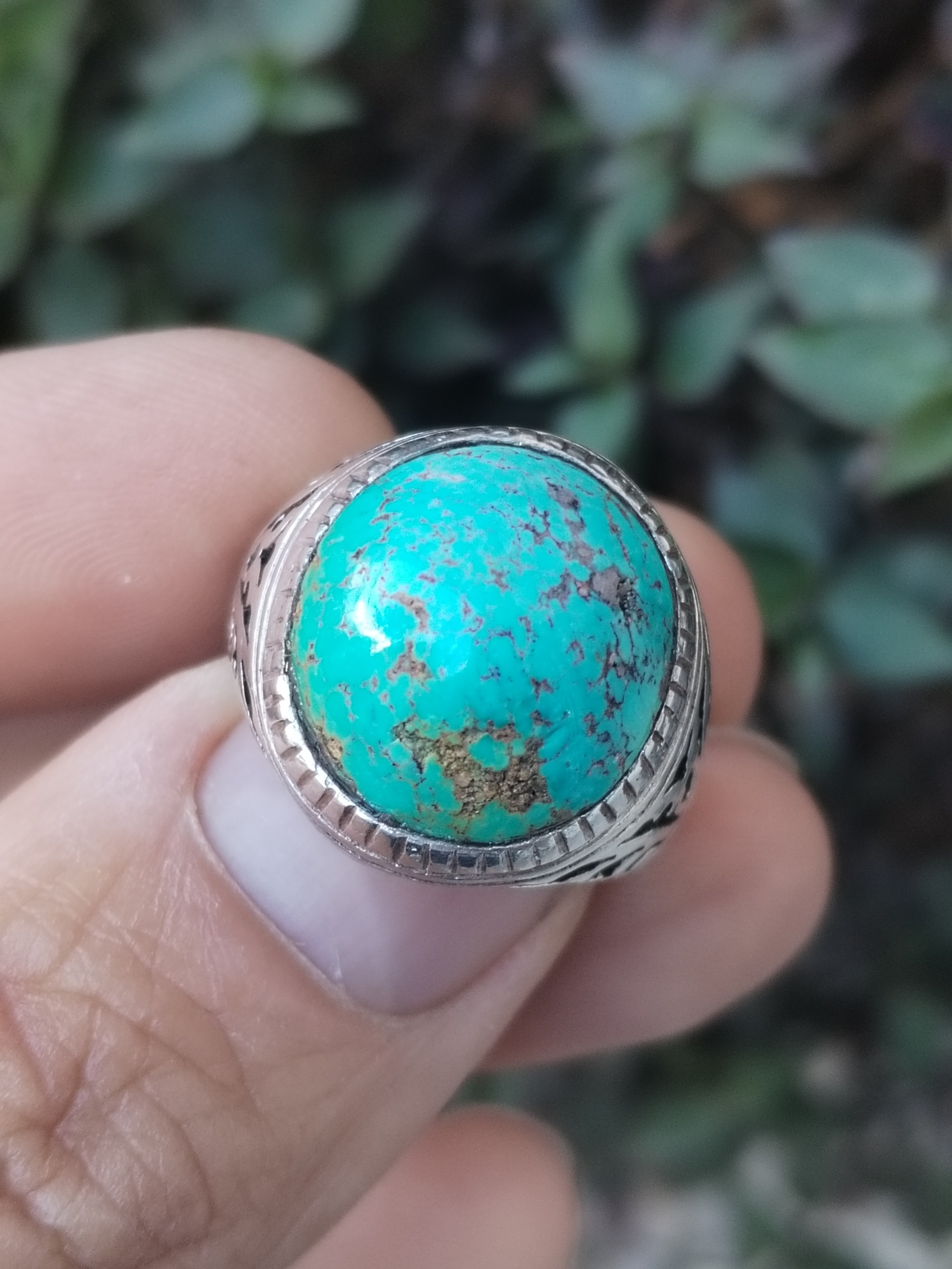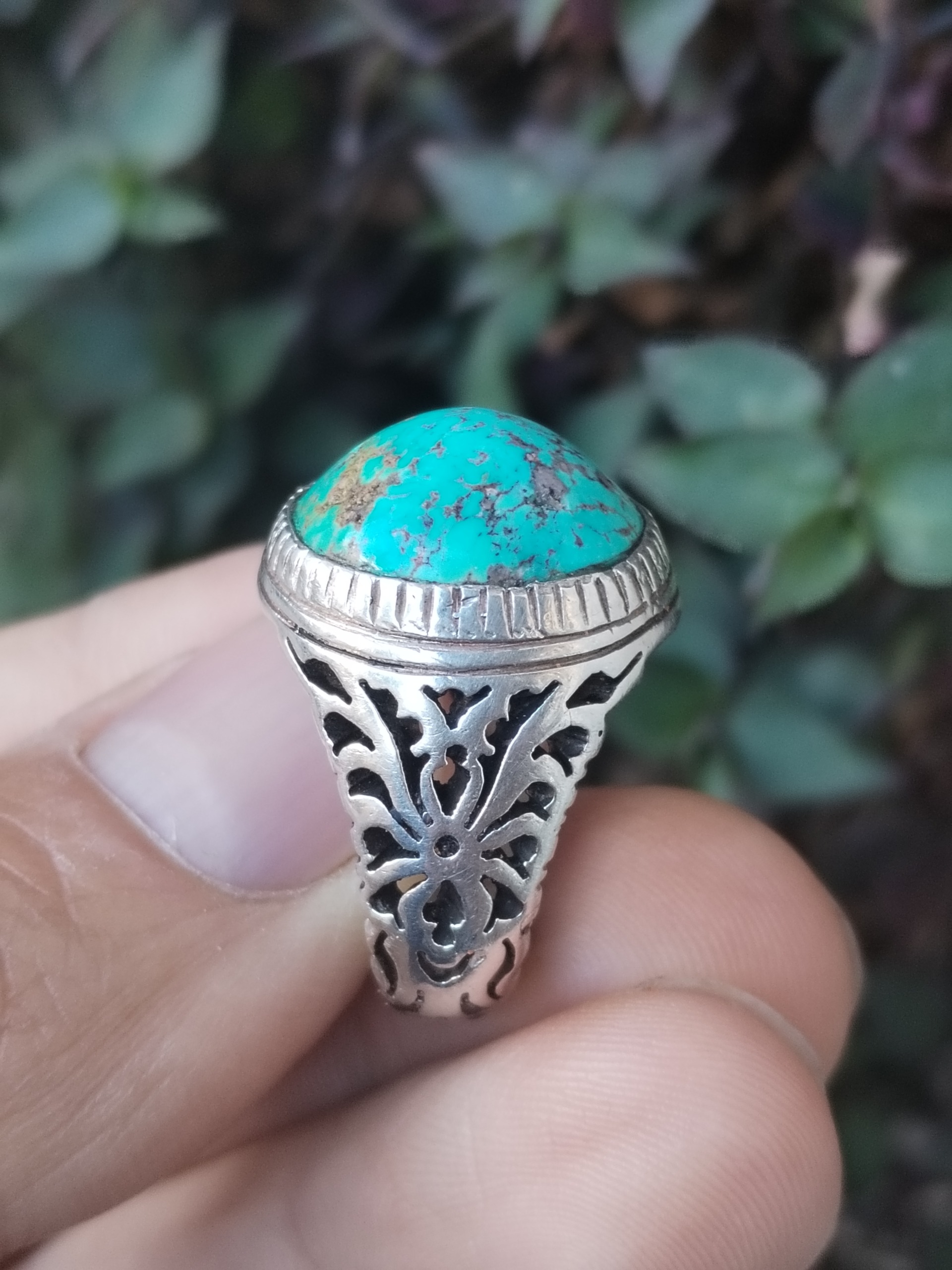 انگشتر زیبای فیروزه نیشابور، طبیعی. بدون احیا. دستساز. رنگ فیروزه یه پره کمرنگ تر از عکسش هست.