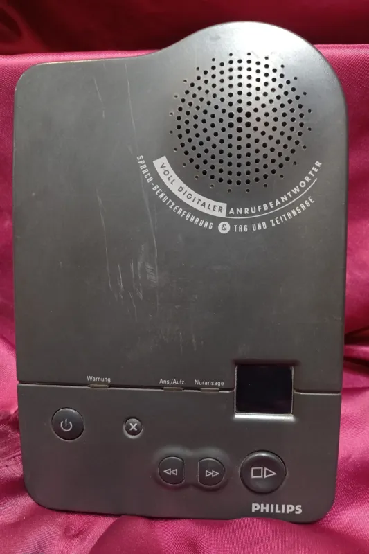 دستگاه فوق قدیمی است و ضمنا پیام ضبط شده بر روی آن آلمانی است . عمر دستگاه بیش از چهل سال است و از آلمان بصورت مستعمل هدیه آورده بودند و مدتی استفاده می کردیم تا اینکه تلفن های جدید به بازار عرضه شد . مارک فیلیپس ، ساخت چین ( PRC )