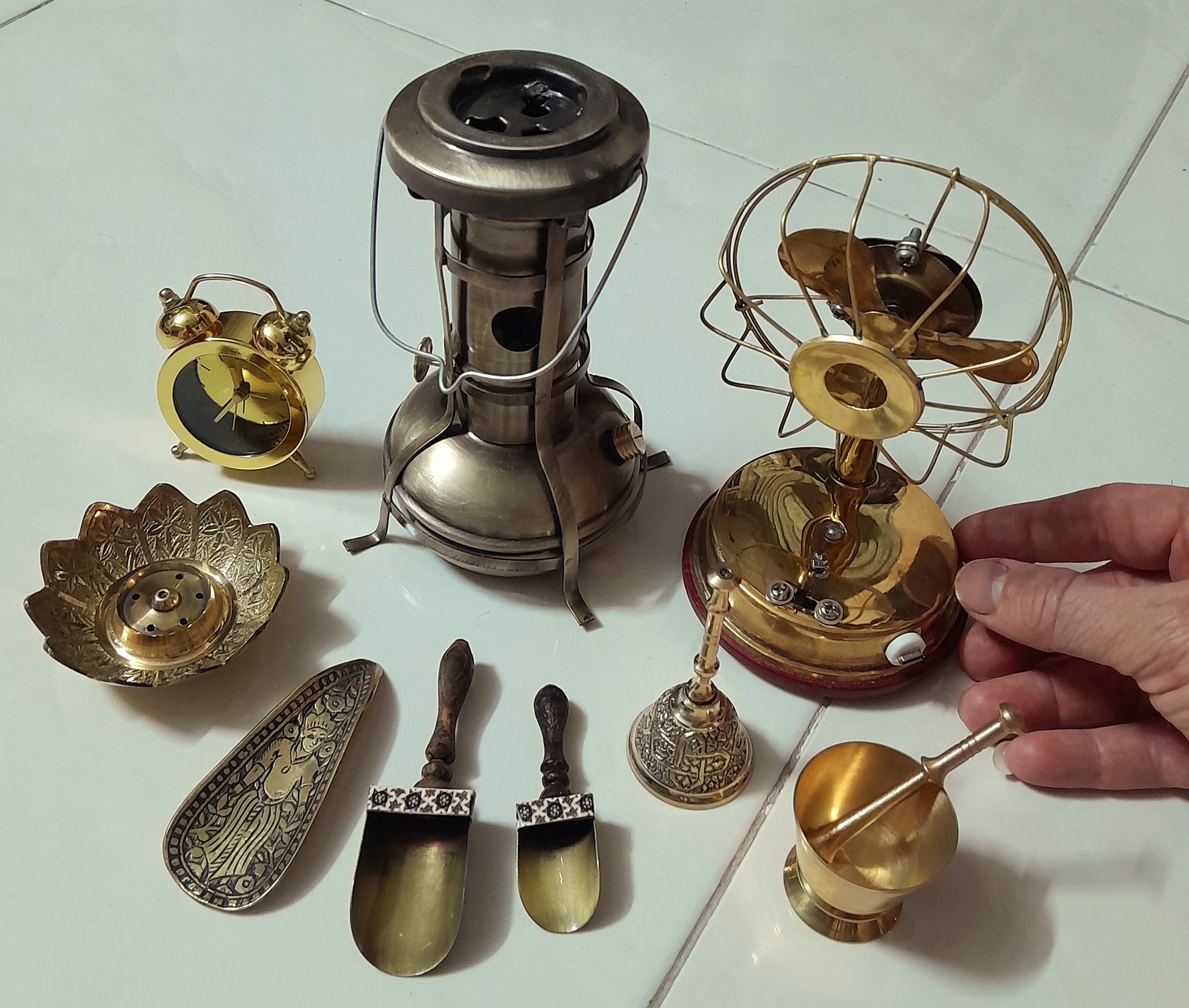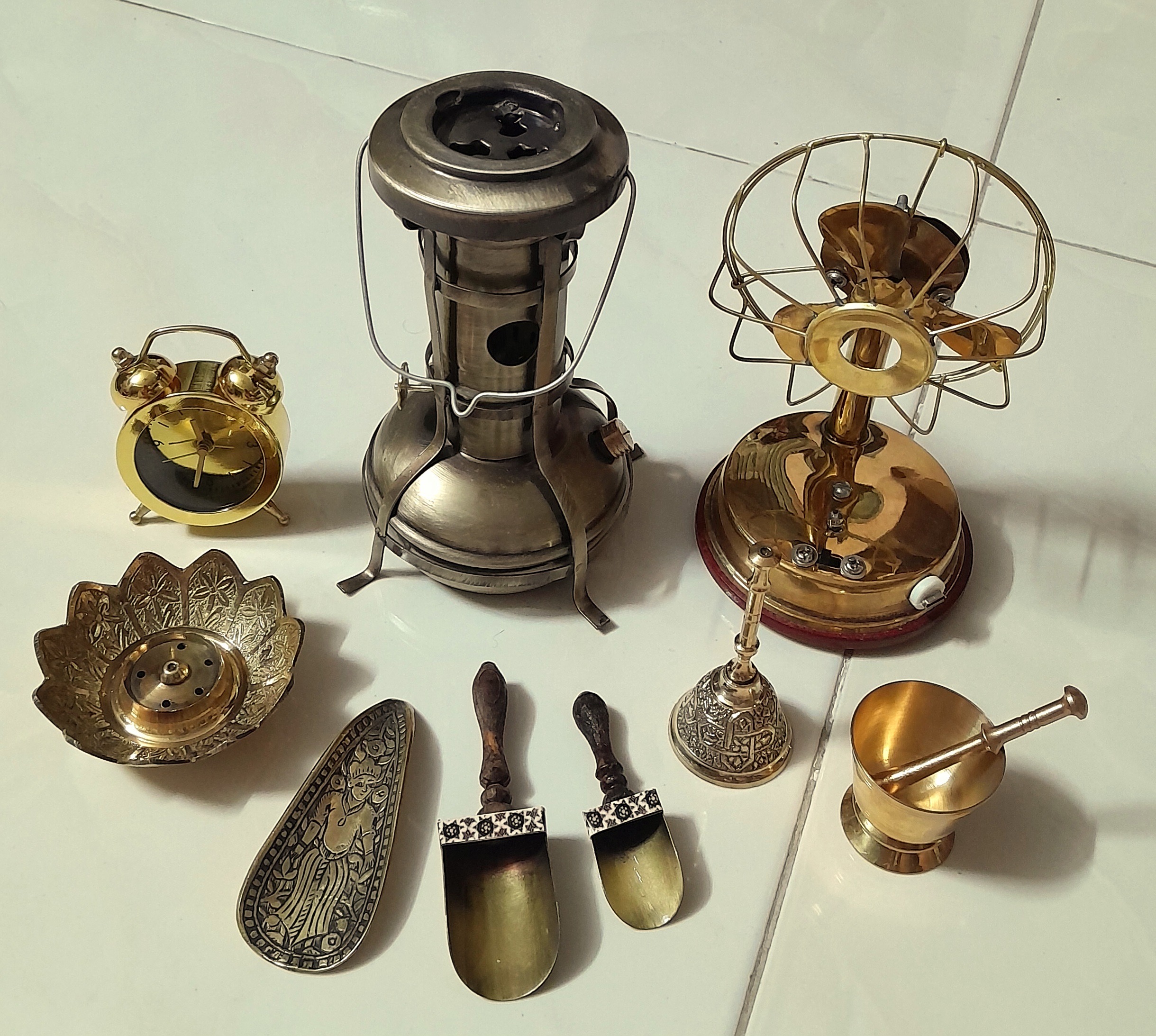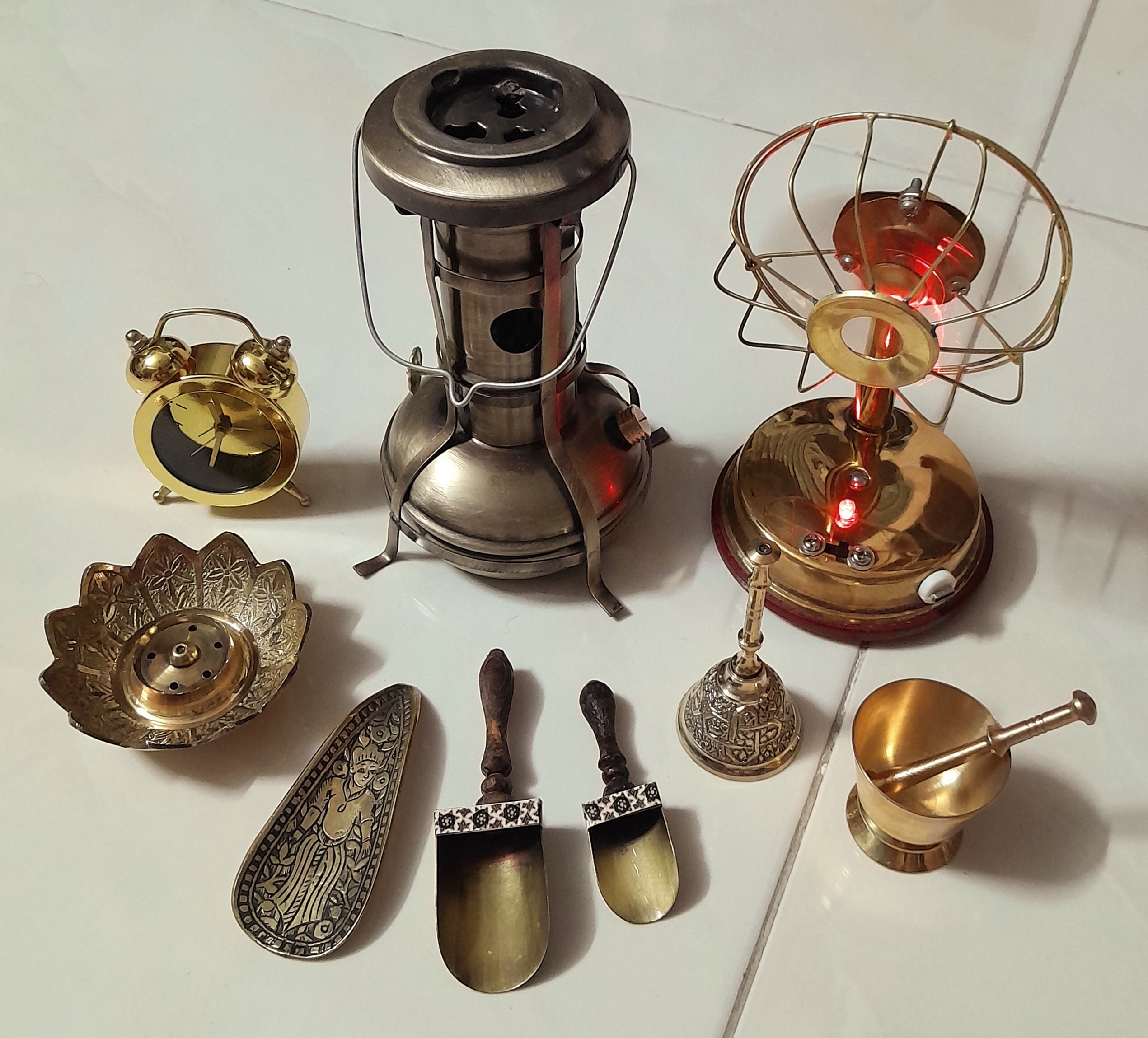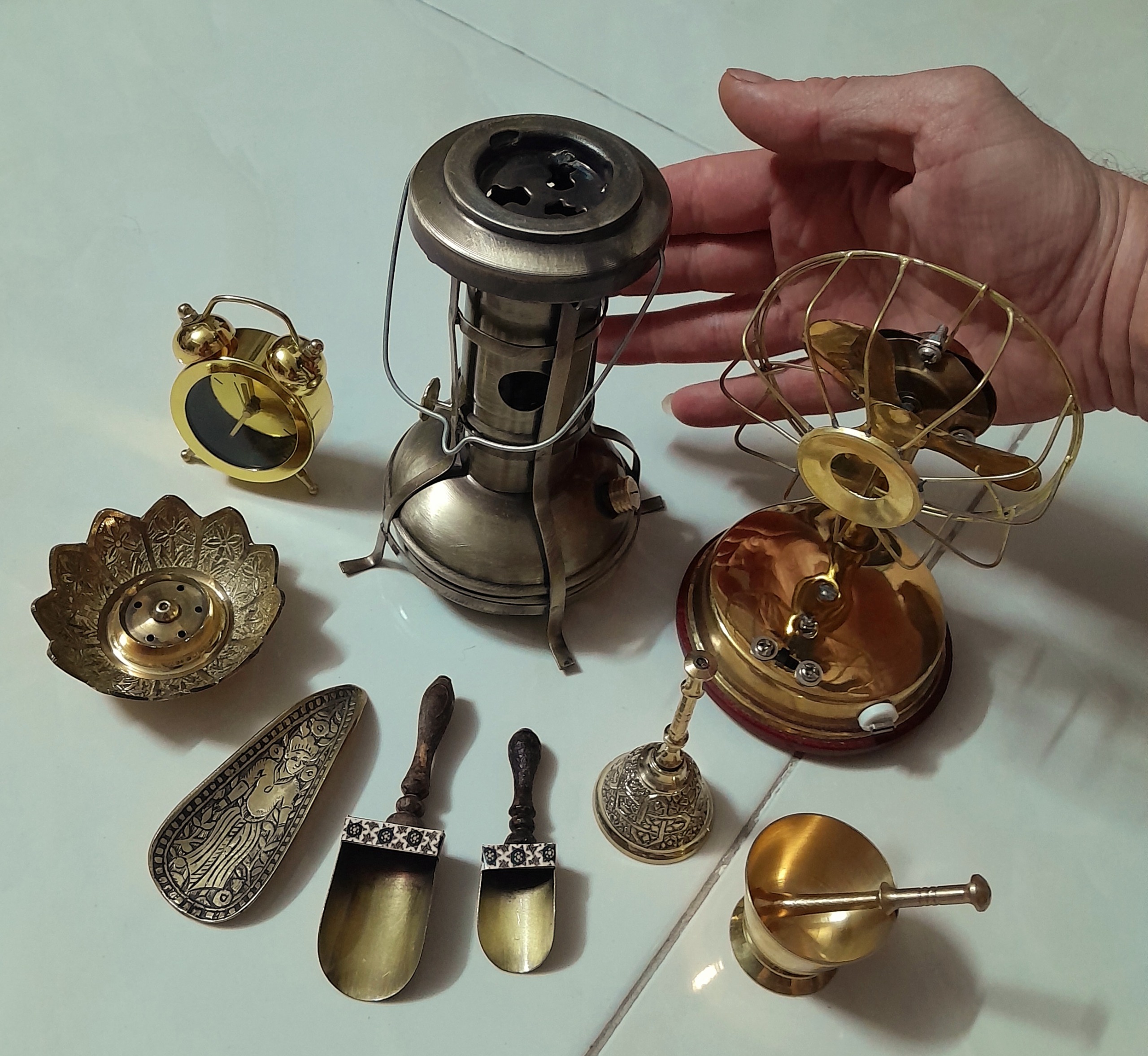 شامل: پنکه برنجی، چراغ علائدین، ساعت، هاونگ زعفران برنجی، زنگوله برنجی منقوش، جفت سرتاس برنجی مینیاتوری، پاشن کش برنجی قلمزنی، جاعودی برنجی منقوش.
