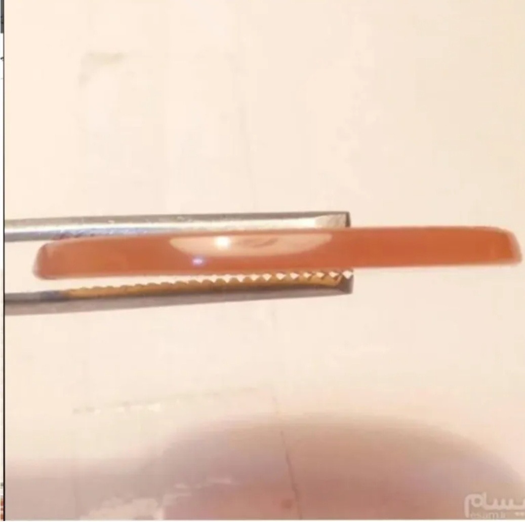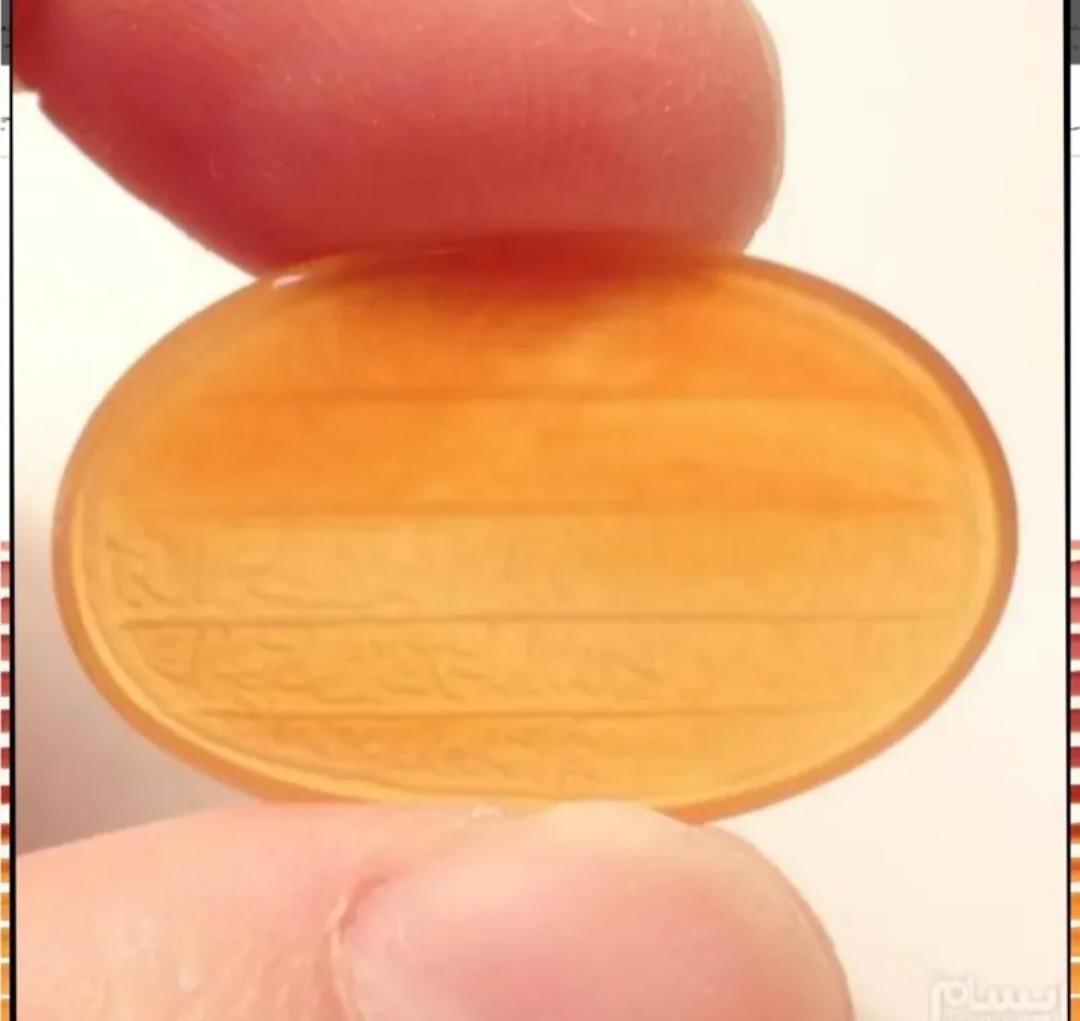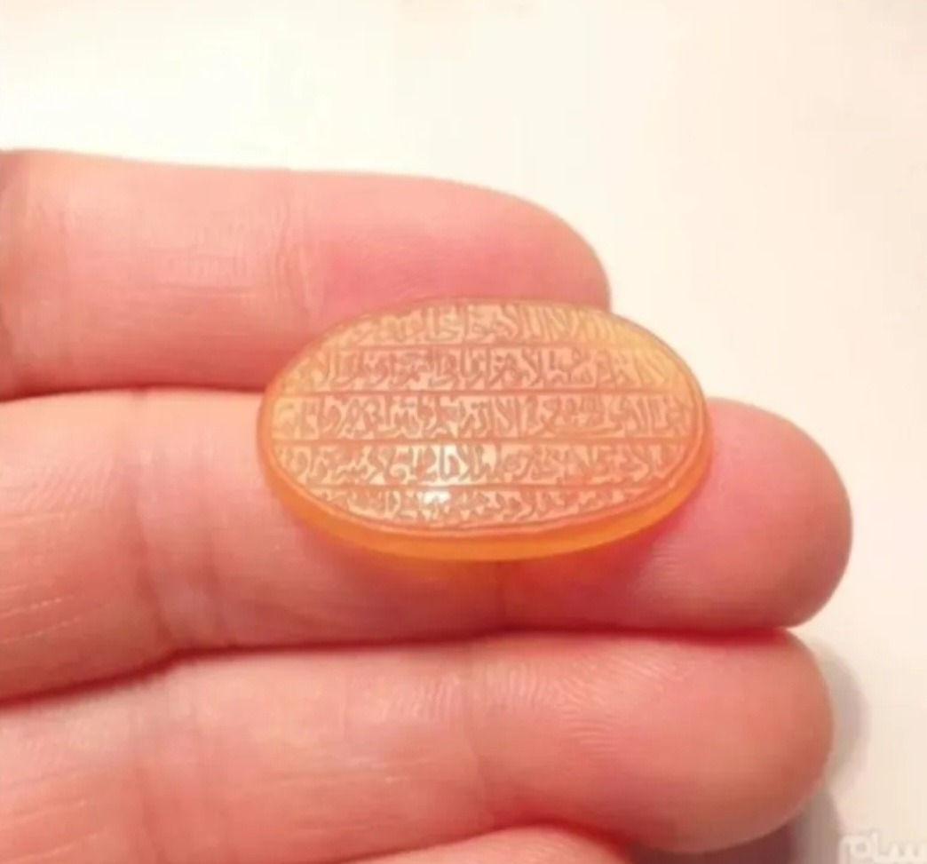یک قطعه عقیق یمنی کهنه نارنجی ، خوش رنگ خوش طبع، با طبع شیشه ای و عالی با تراش بیضی رو و زیر نسبتا تخت که بر روی آن با خط قدیمی و به سبک کوپال و بسیار زیبا و عالی با کرسی چینی آیه ( آیتالکرسی) با ابزار قدیمی حکاکی گردیده است