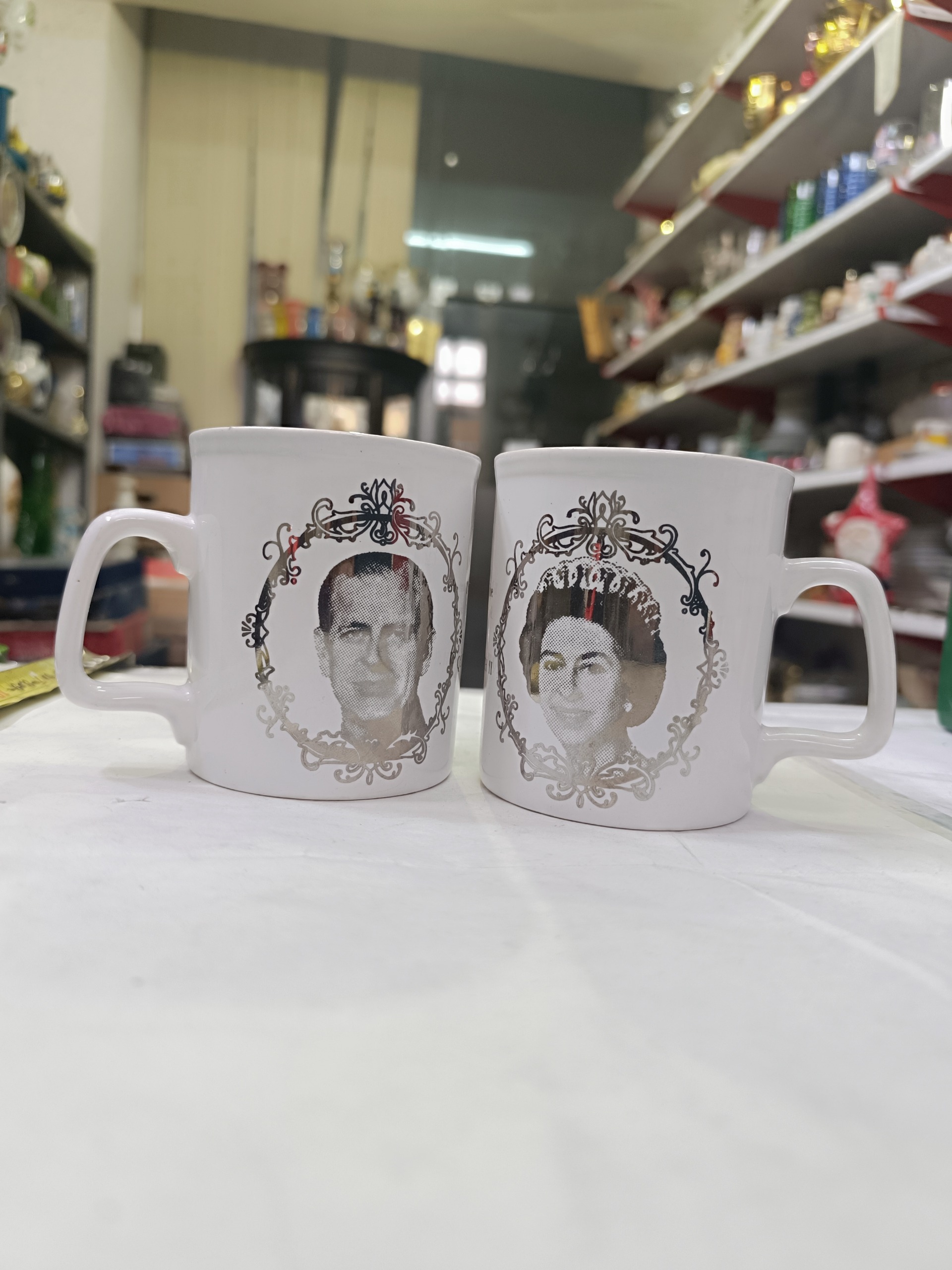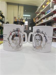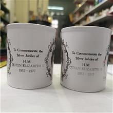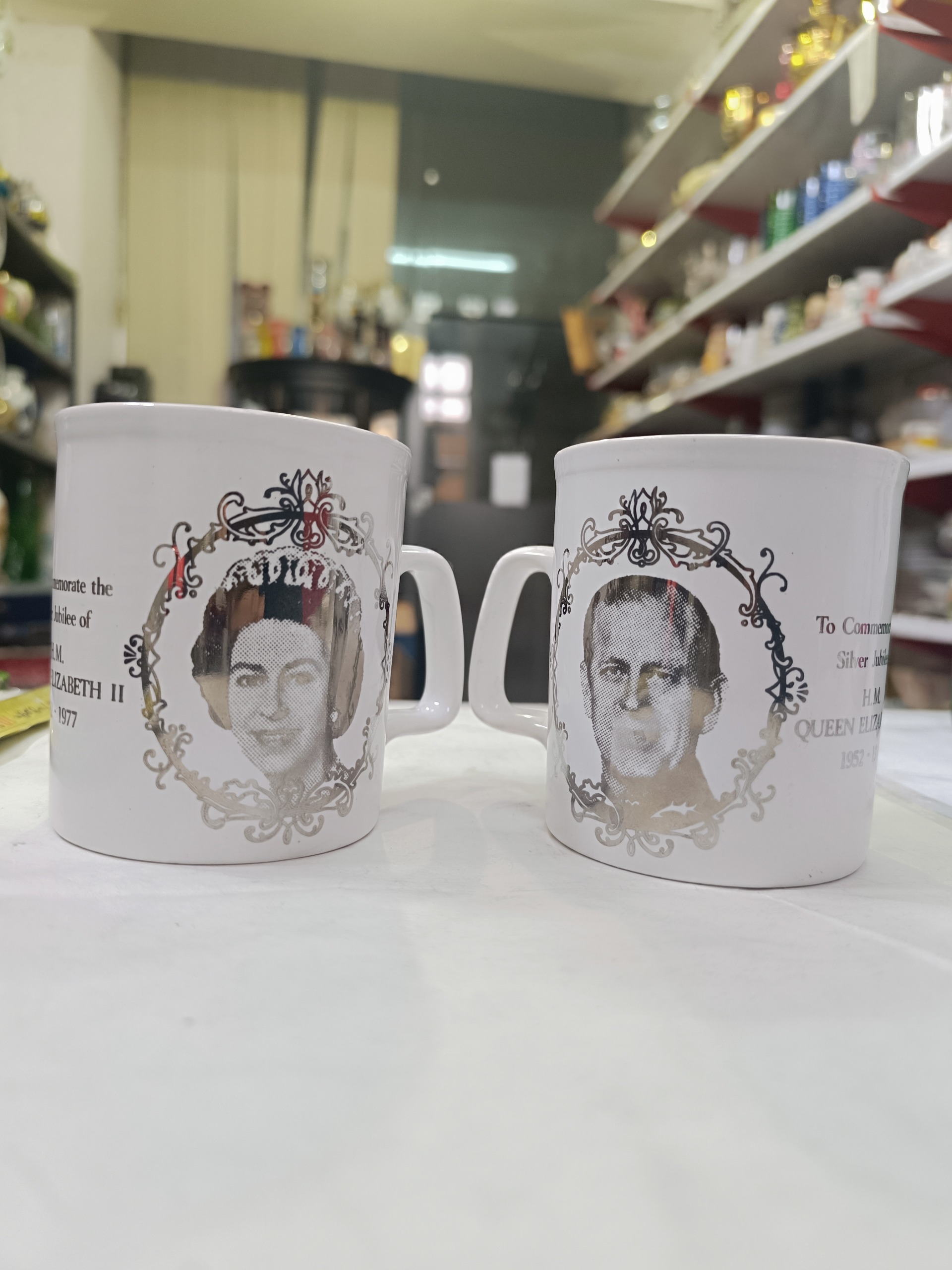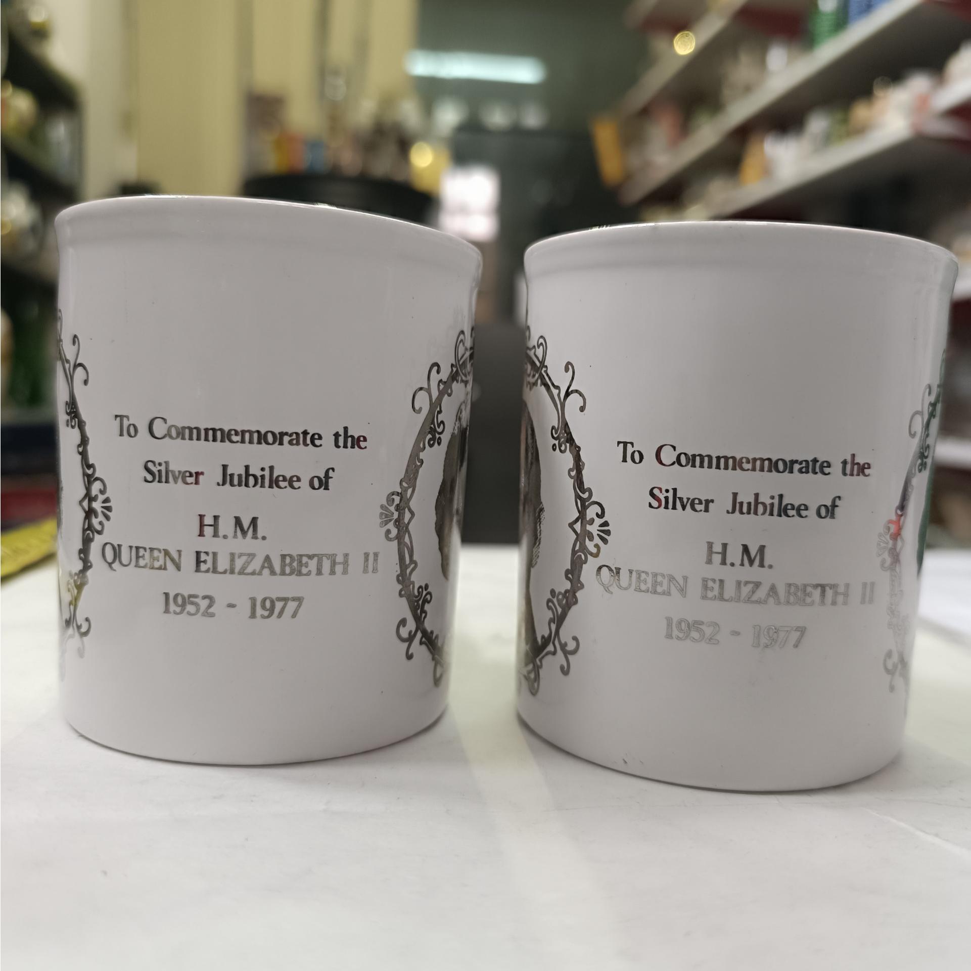 یک جفت ماگ قدیمی کلکسیونی ، به مناسبت پنجاهمین سالگرد سلطنت ملکه الیزابت دوم ، چاپ و نقش نقره ، کاملا سیف برای شستشو ، تهیه شده از سنگ آهن انگلیسی ، ساخت انگلستان ، کیفیت نو و تمیز و سالم ، فروش بصورت جفتی