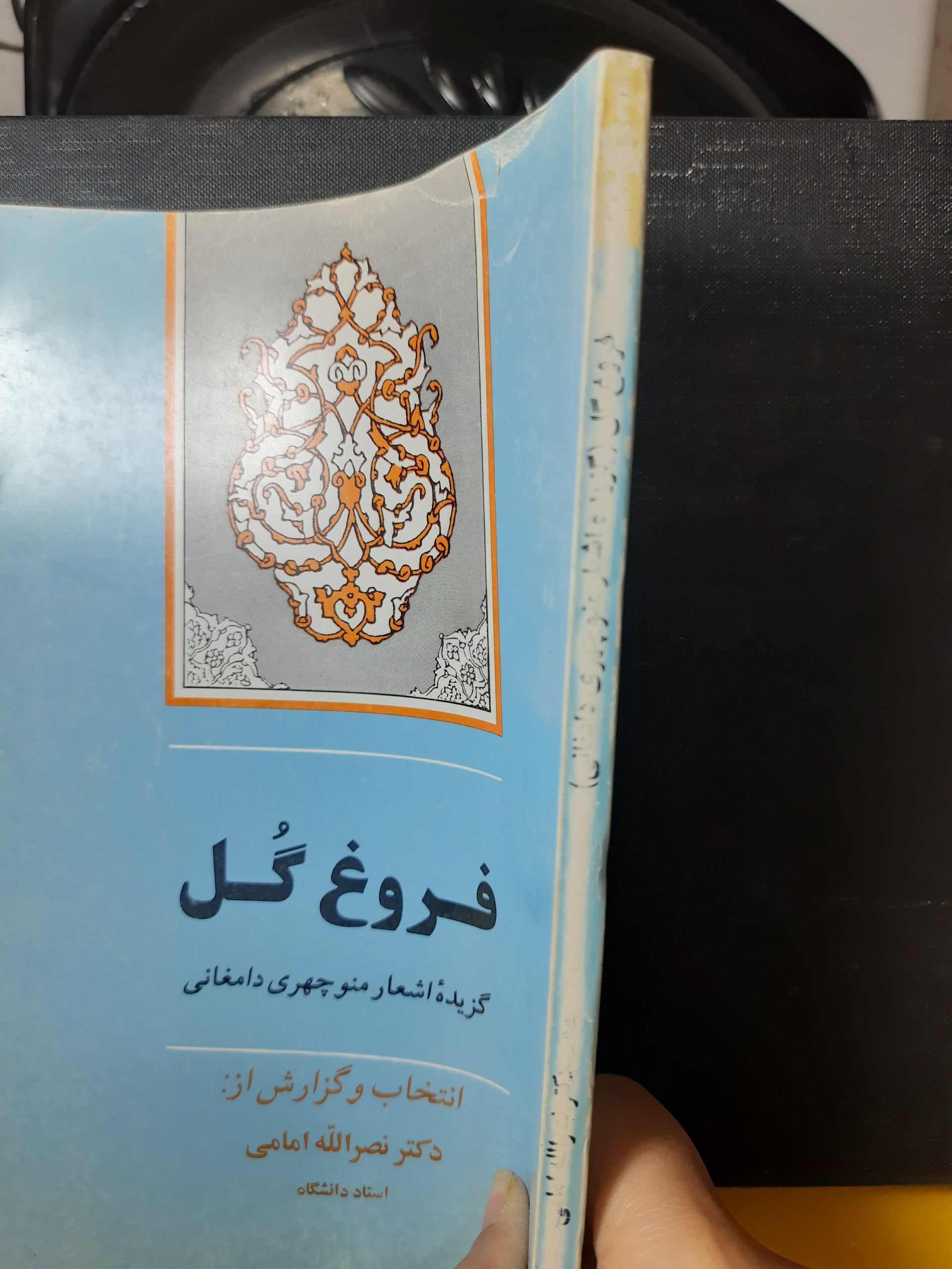 کتاب روغ گل گزیده اشعار منوچهر دامغانی به قلم نصرالله امامی چاپ اول سال 79 در 160 صفحه/ قسمتهایی از جلد مطابق تصاویر زدگی و رنگ پریدگی دارد