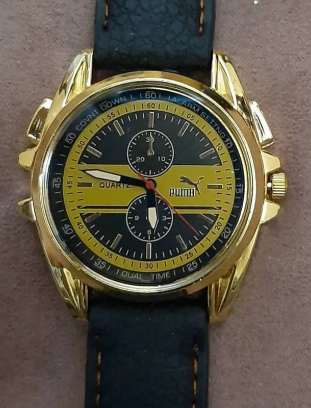 ساعت کوارتز پوما سالم و دقیق بسیار زیبا طراحی شده است آکبند و طرح دو موتوره است و بندش نرم و محکم است.لطفا از ساعت های دیگر ما بازدید کنید.5 عدد ساعت موجوده هر کدام 350 تومن هر کدام که خواستین پیام بدین اونو بفرستم به عکس ها نگاه کنید.