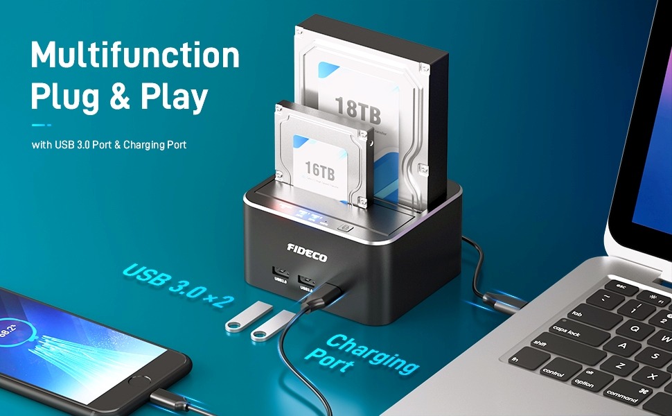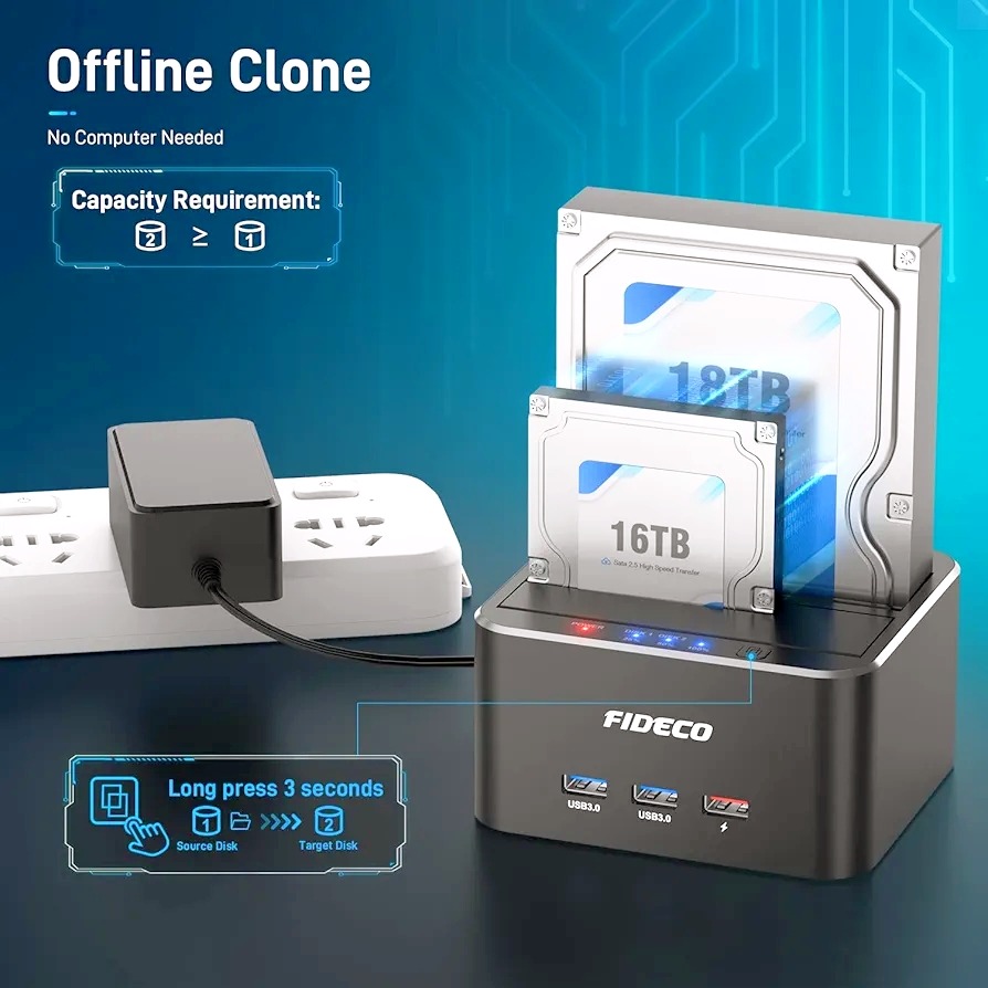 داک هارد دیسک آلومینیومی FIDECO، داک USB 3.0 برای هارد دیسک یا SSD ساتا 2.5 و 3.5 اینچی، پشتیبانی از کلون آفلاین